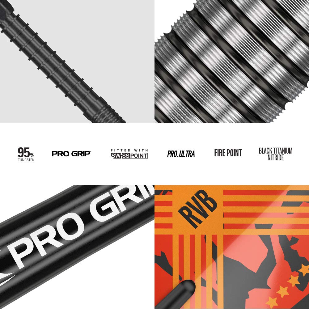 - Complete Dart Set: Includes three barrels, three black Pro Grip shafts, three RVB-designed flights, three Swiss Point Firepoints, and a Swiss Point tool.