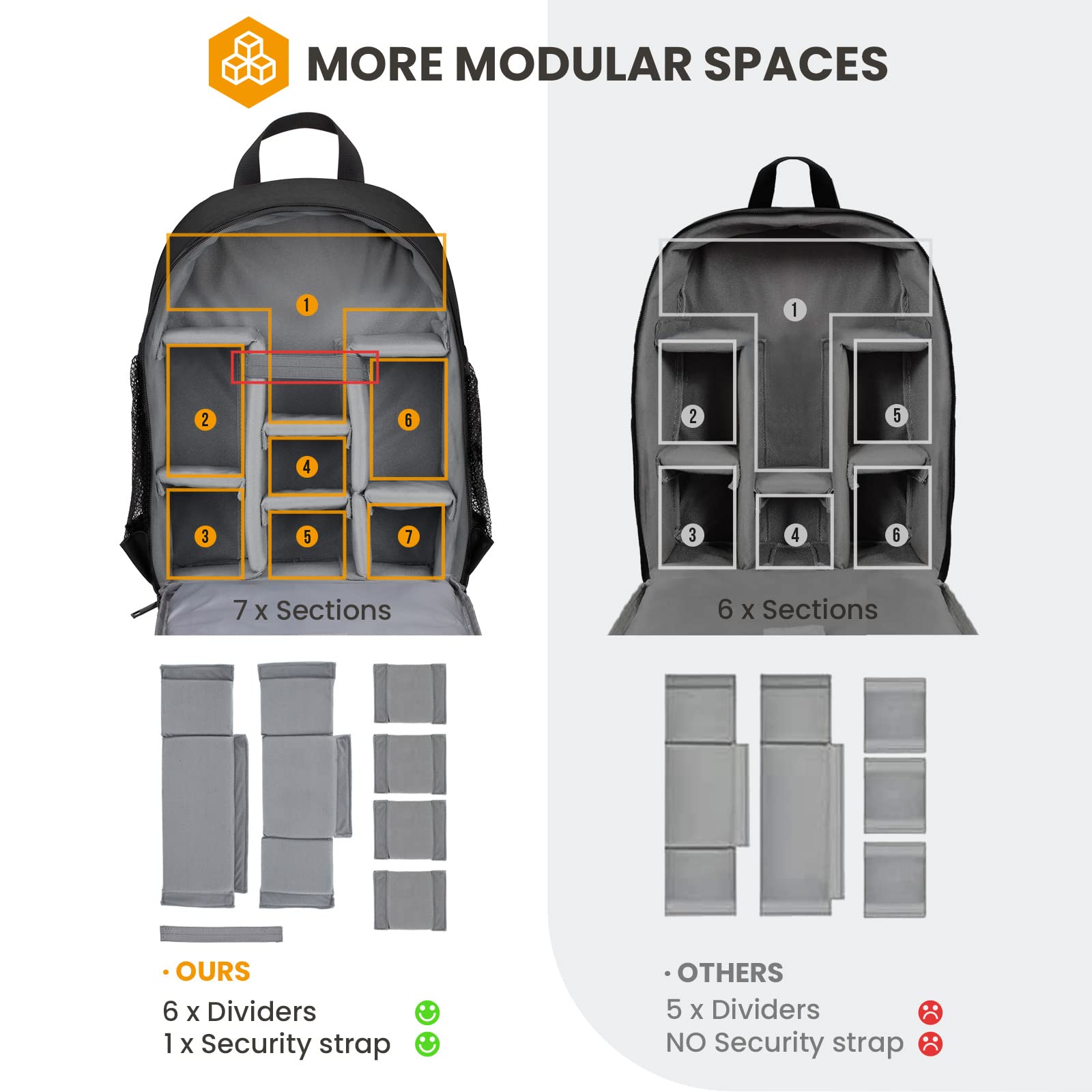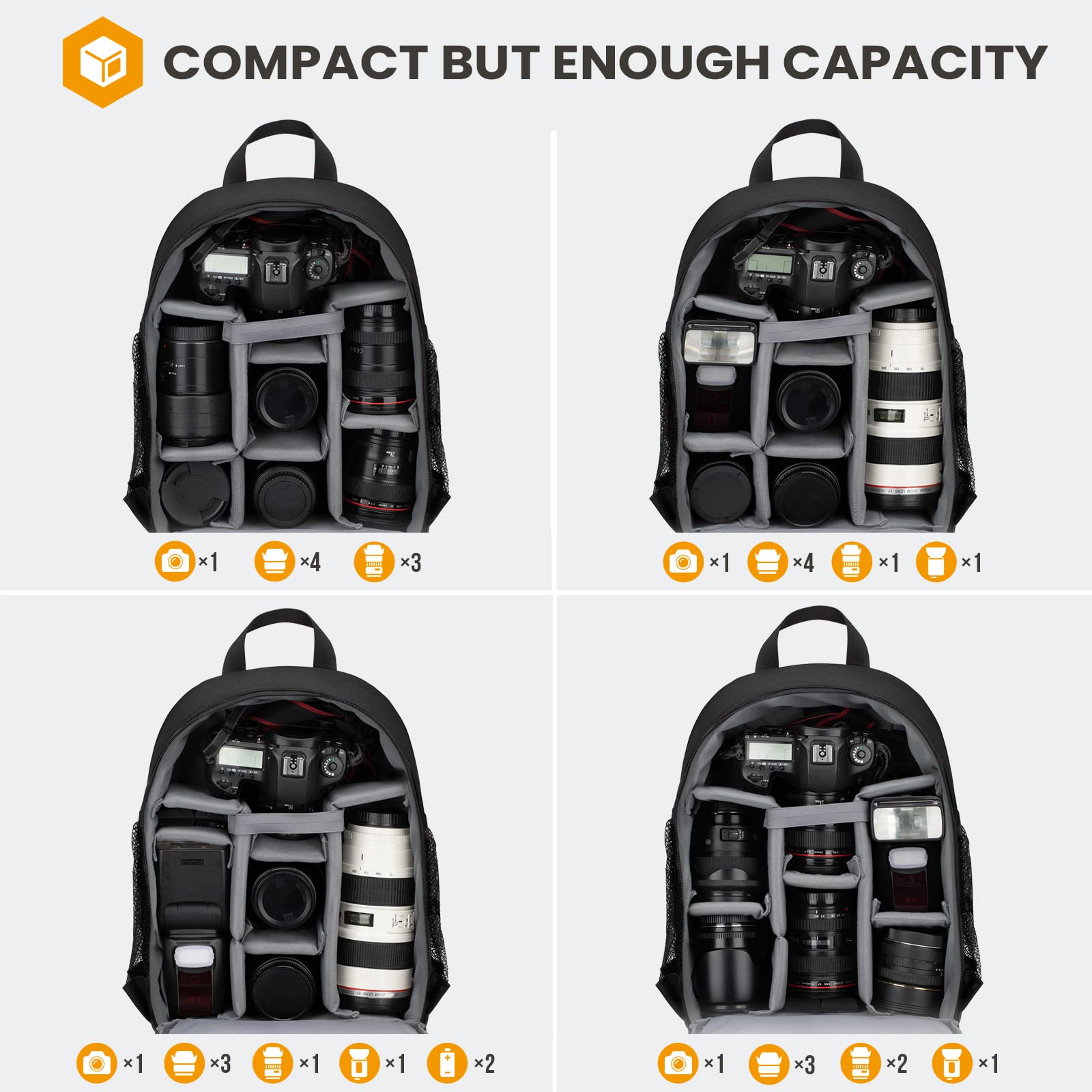 - Durable & Waterproof: Made from high-quality polyester material, this backpack features shockproof dividers and a waterproof rain cover to safeguard your gear in all conditions.
