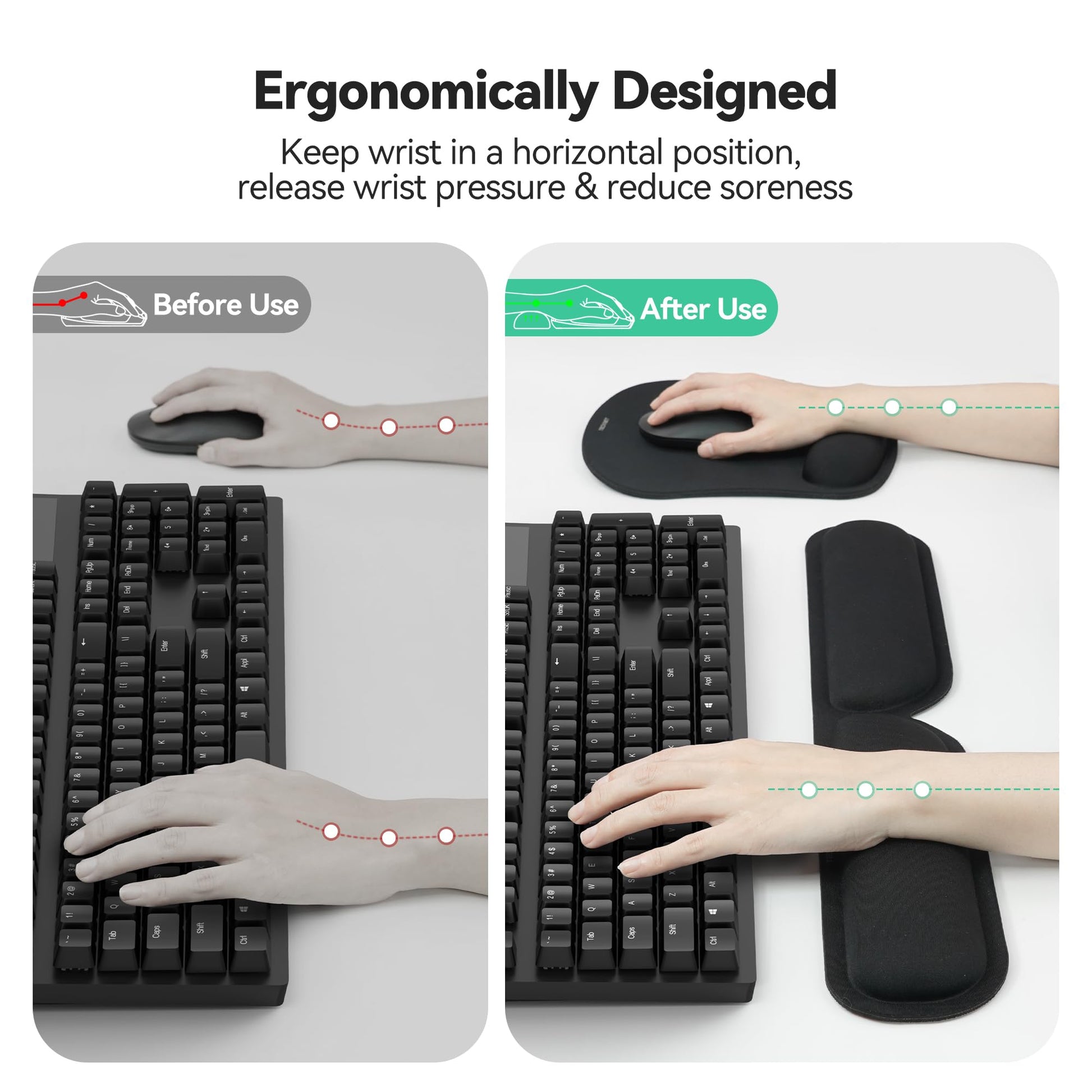 - Ergonomic Design: The wave design of the wrist supports perfectly contours to the natural shape of your wrists, mitigating fatigue and alleviating discomfort from extended typing or mouse use.