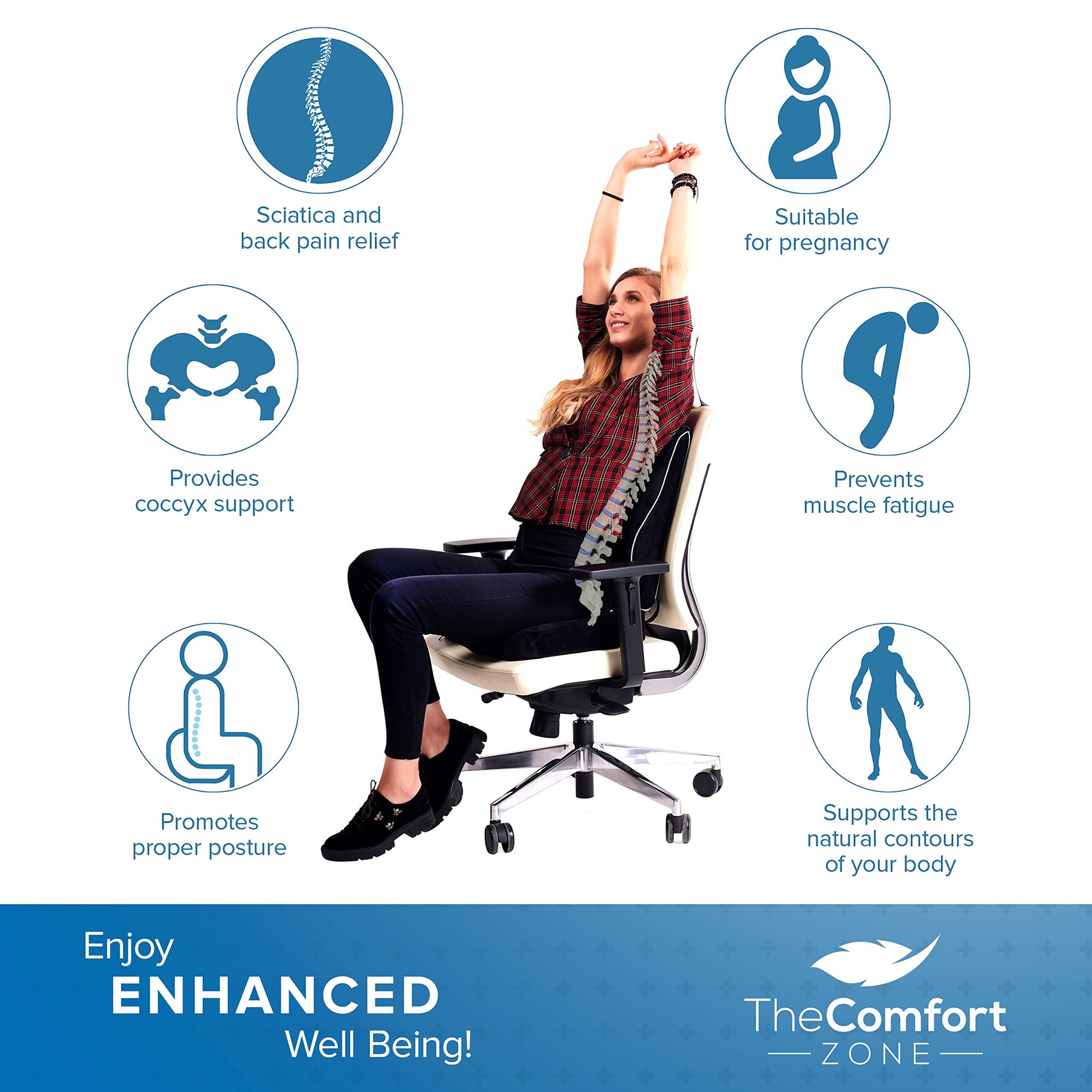 - Pressure Relief and Pain Prevention: Designed to reduce pressure on the spine, coccyx, and tailbone, providing relief from lower back pain and sciatica.