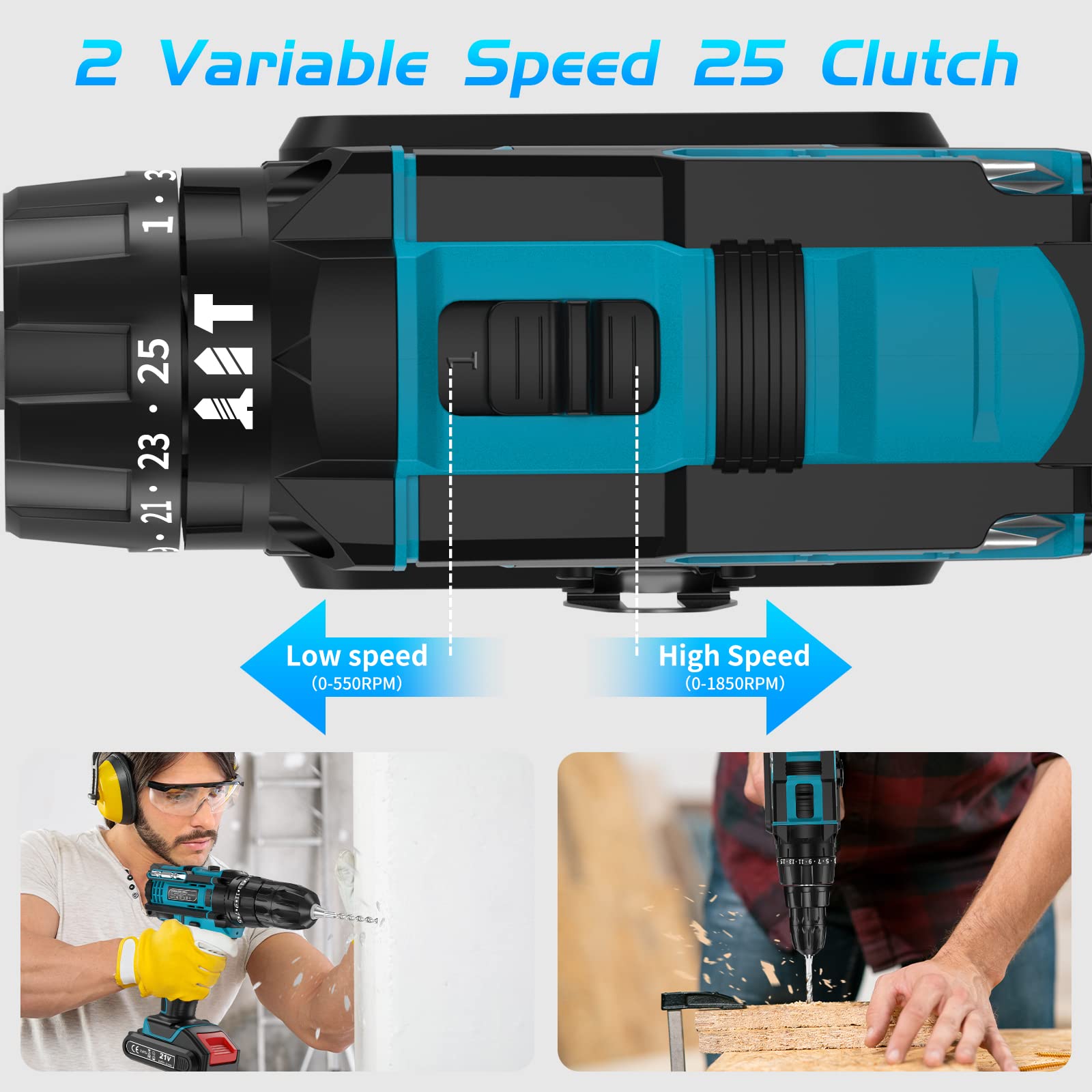 - 25-Position Clutch and 2 Speed Gears: The drill offers two speed ranges (0-550 rpm and 0-1850 rpm) and 25 torque settings, providing precise control for various applications.