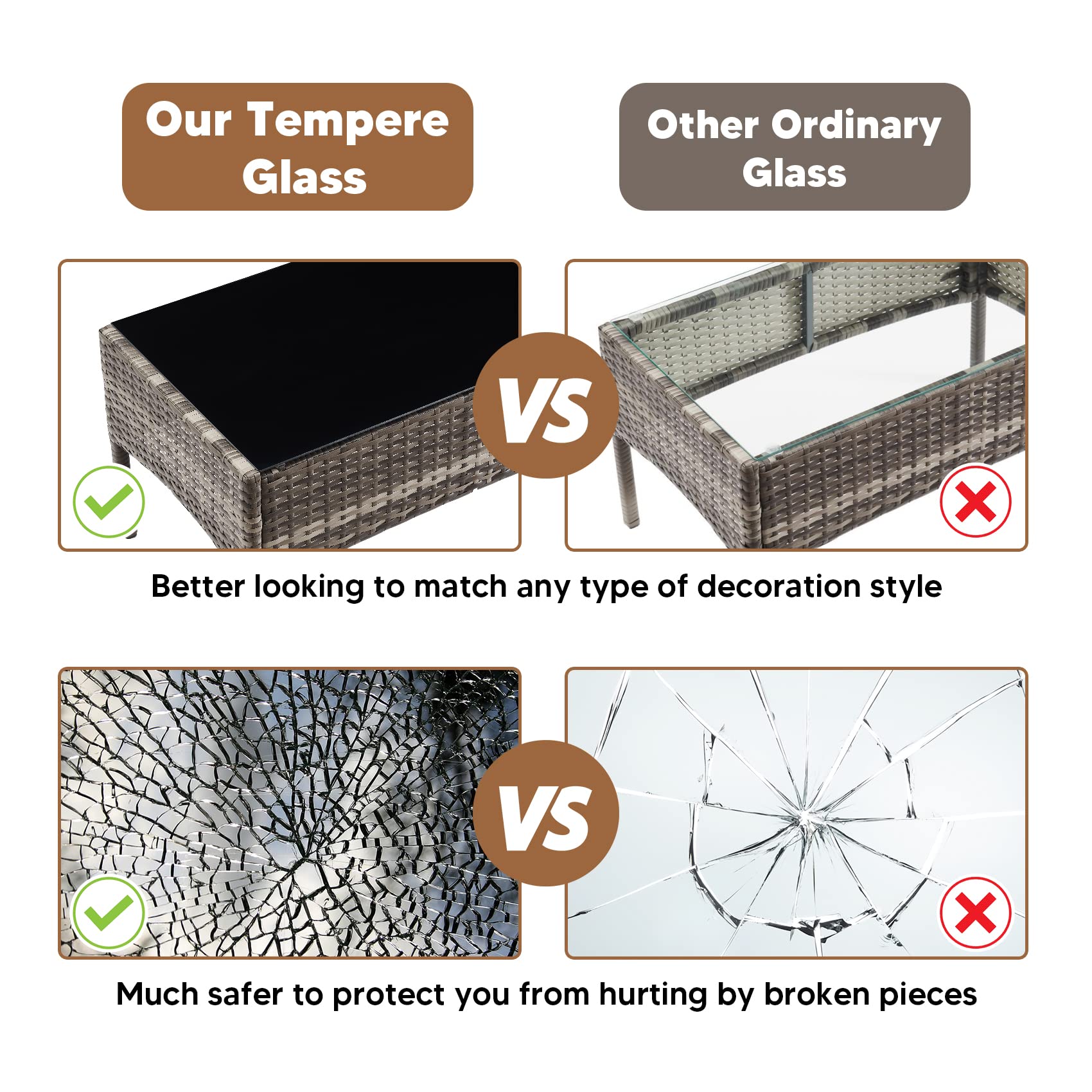 - Materials: Galvanised steel frame, PE rattan, tempered glass tabletop