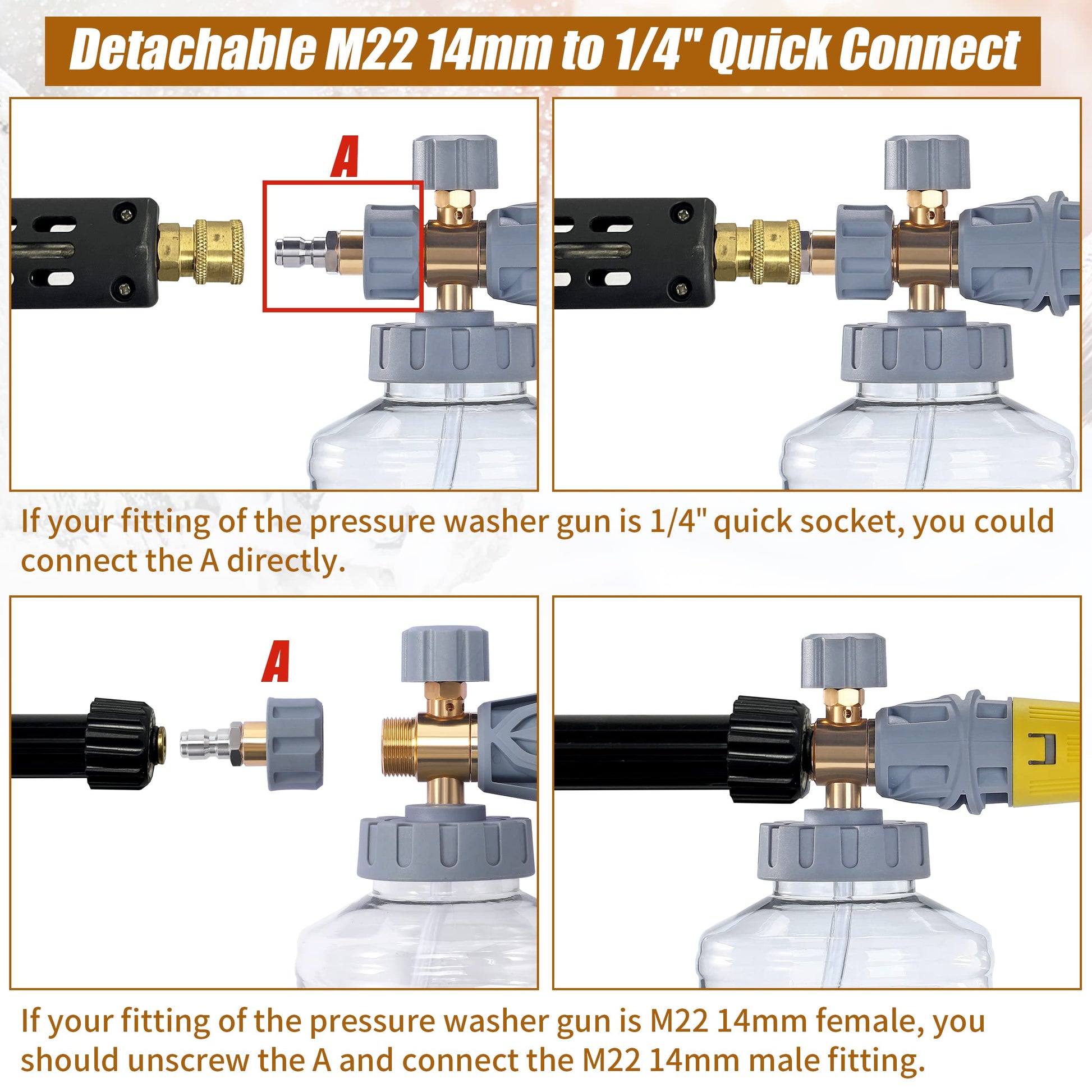 - Multiple Connection Methods: The foam cannon includes both a 1/4 Inch Quick Connector and an M22 14mm fitting, making it versatile and compatible with a wide range of pressure washers.