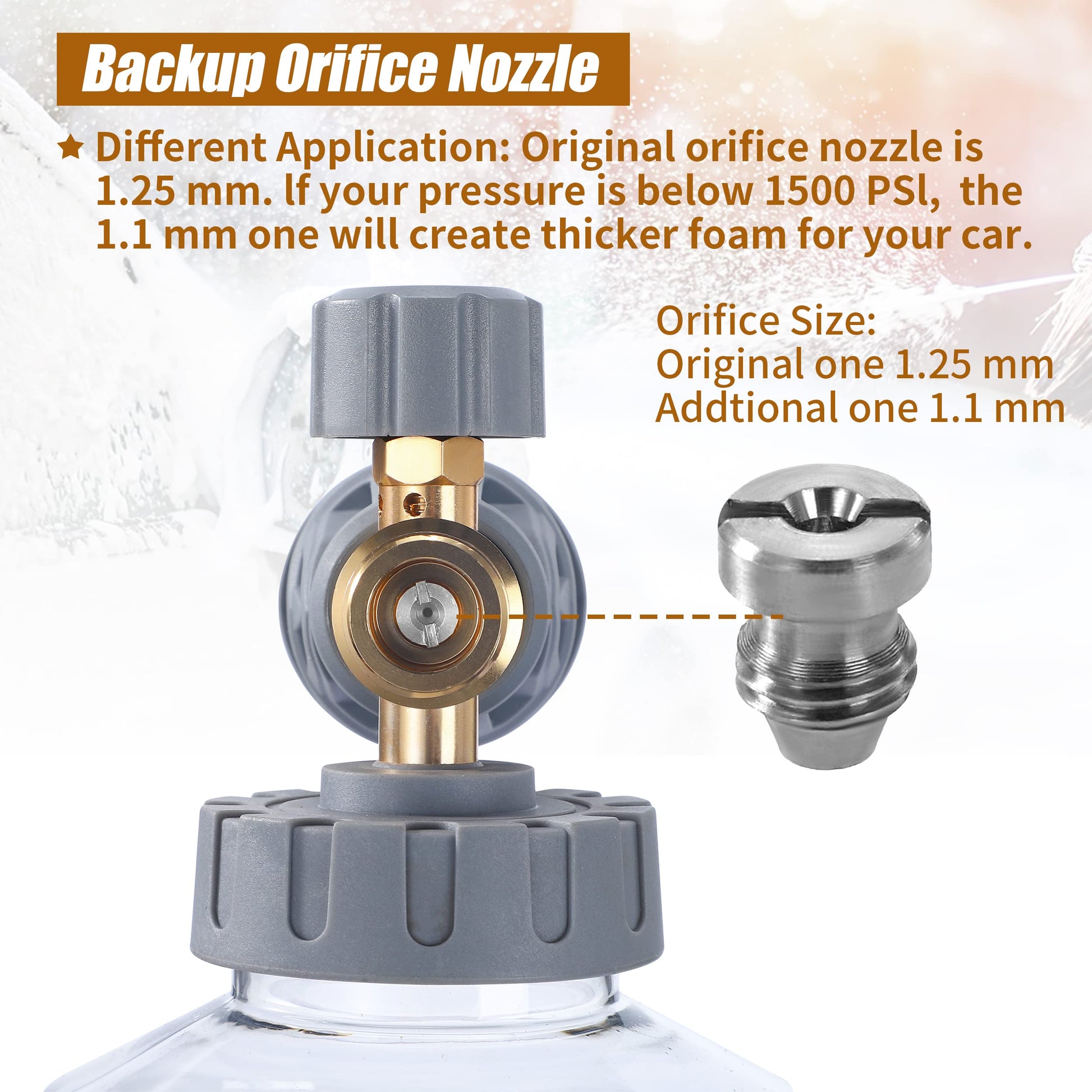 - Alternate Orifice Nozzle: Comes with an additional 1.1mm orifice nozzle for lower PSI settings (under 1500 PSI), ensuring thicker foam for lighter cleaning needs.