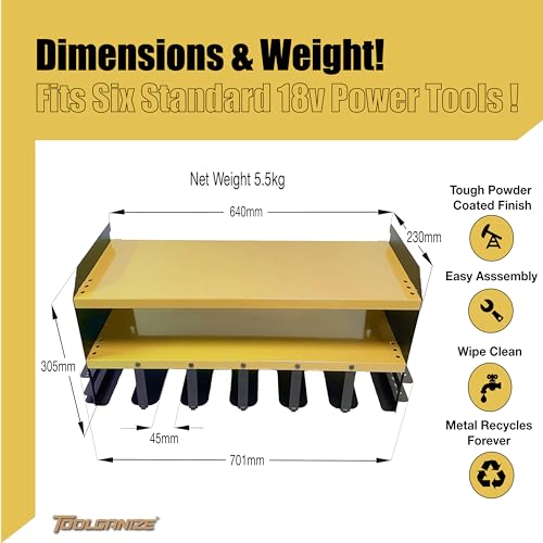 - Ultimate Organisation: With six power tool slots and two steel storage shelves, this organiser holds all your tools in one place, ensuring quick access and saving you time on every project.