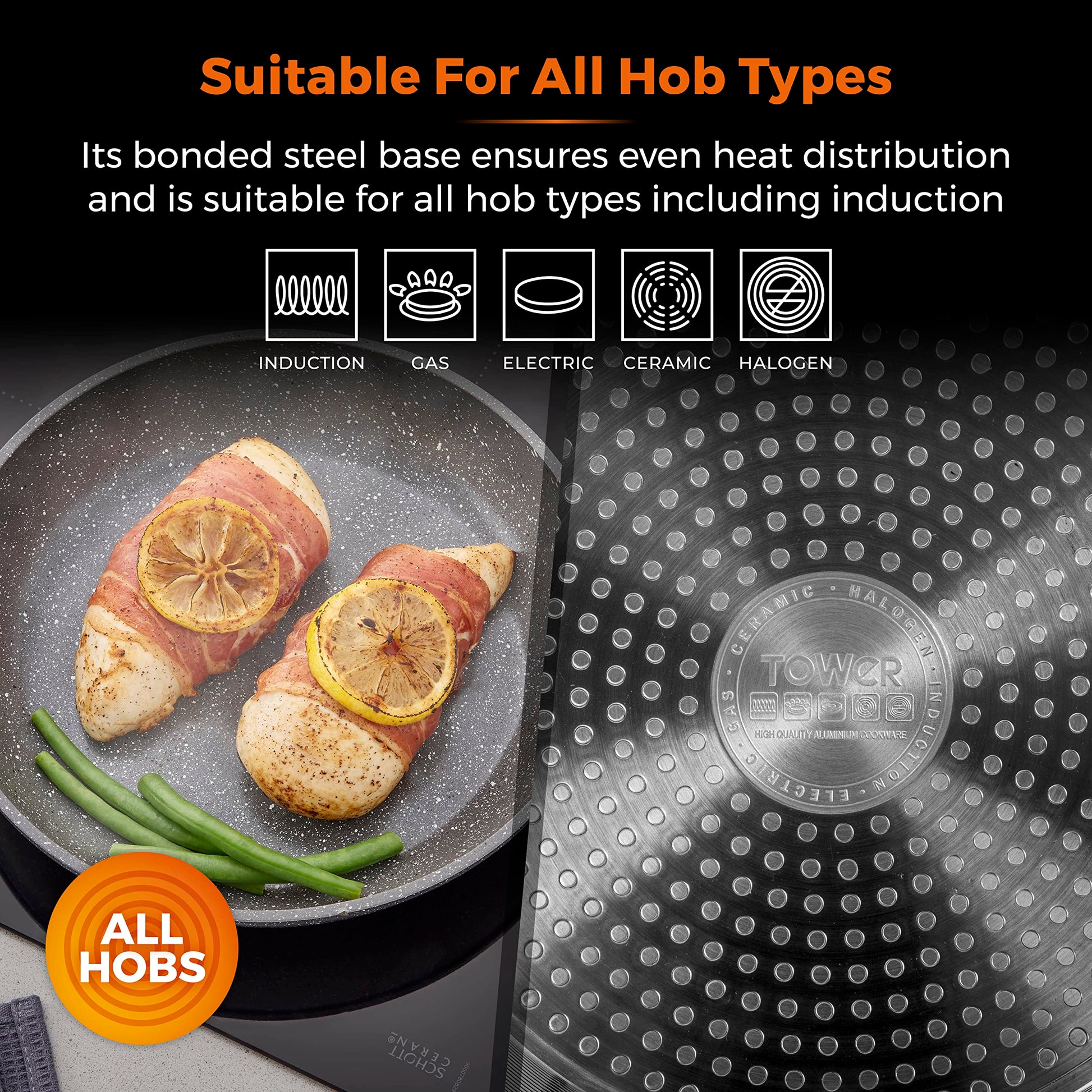 - Bonded Steel Base: Ensures even heat distribution across the pan, delivering better cooking results, and it's suitable for all hob types, including induction.