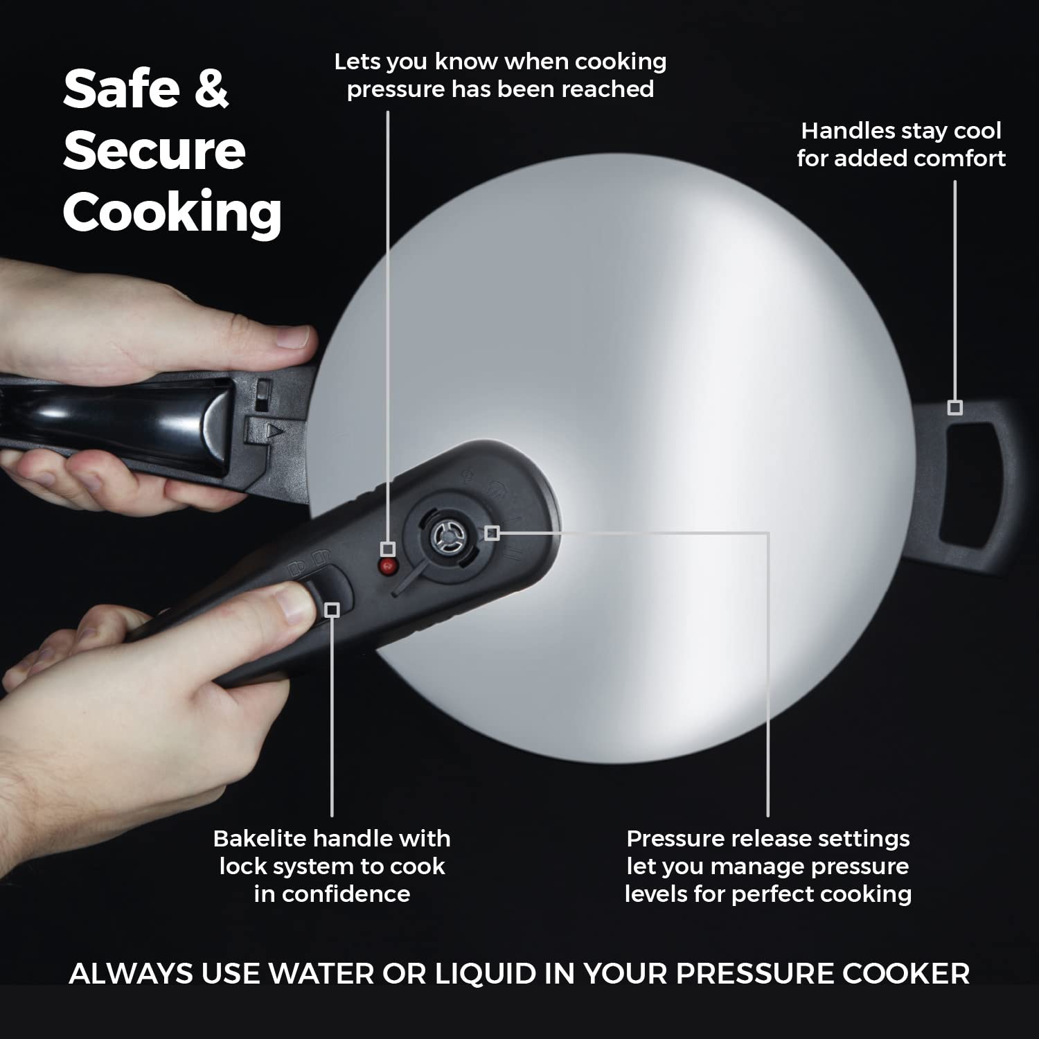 - Ultimate Safety: Features a pressure indicator valve, two pressure release settings for various foods, and a durable Bakelite handle with a locking system for complete control during cooking.