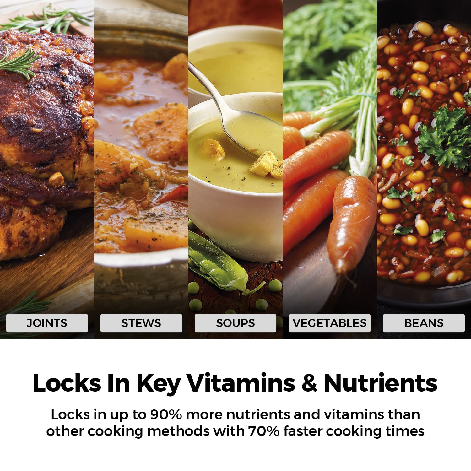 - Healthy Cooking: Retains up to 90% more vitamins and nutrients than traditional cooking methods, perfect for making stews, soups, vegetables, beans, and more.