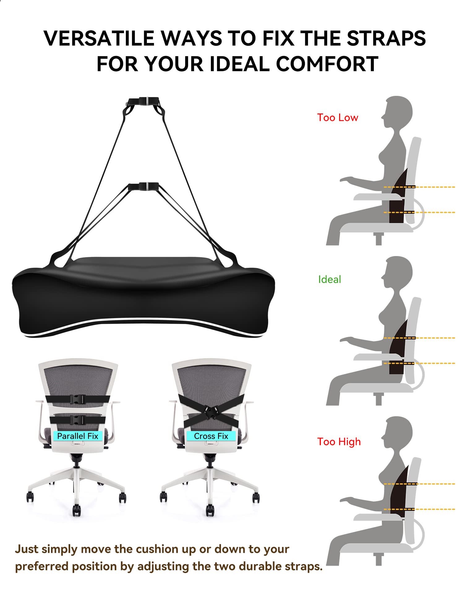 - Adjustable Straps for a Secure Fit: Equipped with two flexible straps and buckles that adjust up to 57" (145cm), keeping the cushion securely in place on a variety of chairs, including office chairs, car seats, and sofas.