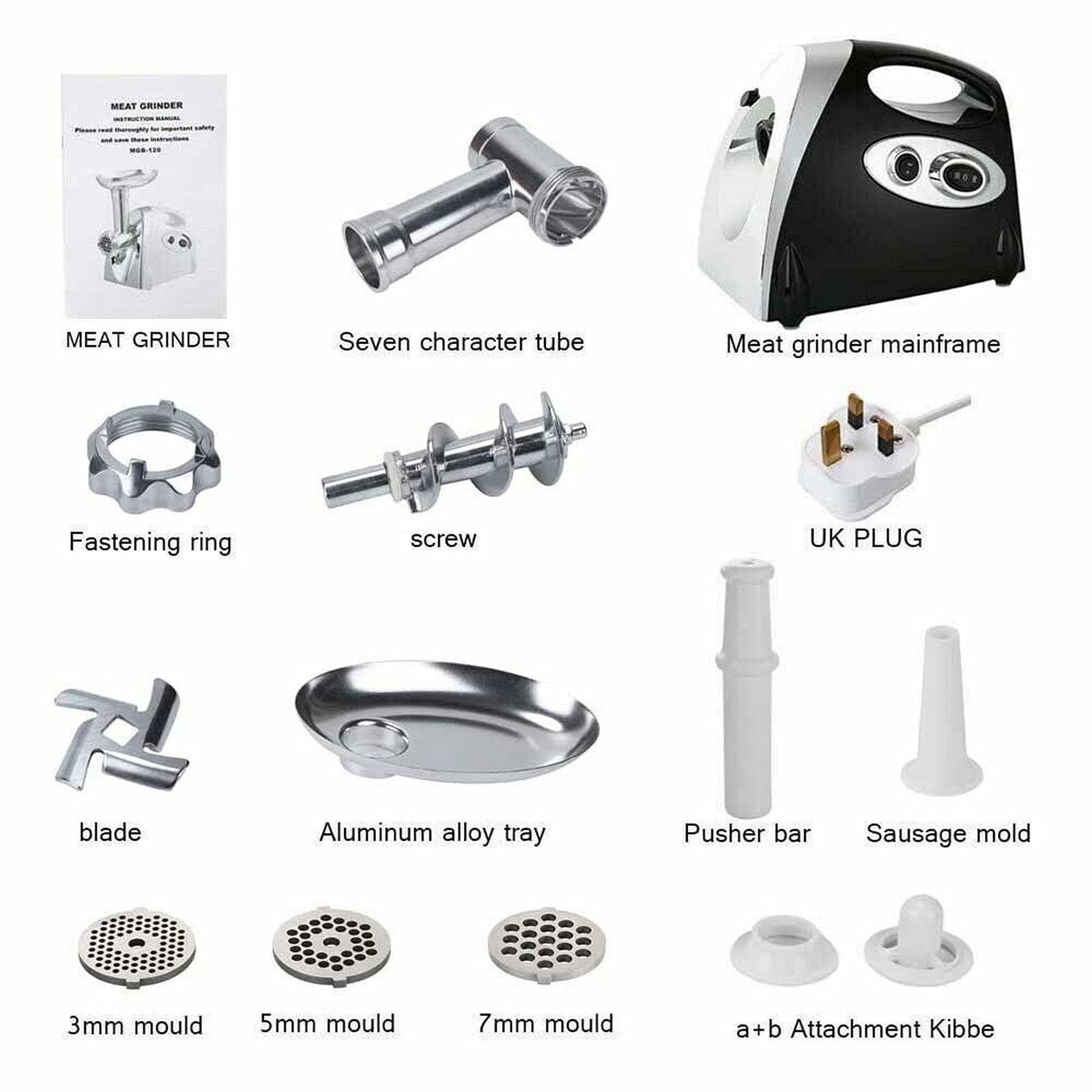 - Efficient Motor: Powered by a robust 2800W copper motor, this meat grinder quickly processes large quantities of meat or vegetables. The set includes three stainless steel cutting plates, offering flexibility for burgers, sausages, meatballs, and more.