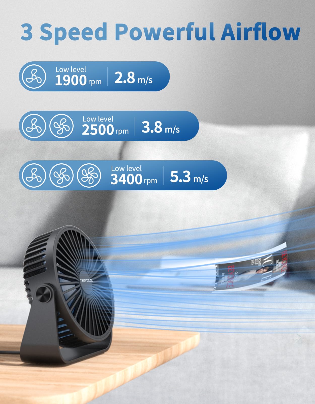 - TriPole USB Desk Fan | 3 Speeds Adjustable Strong Wind Table Fan | 360°Head Rotation | Indoor or Outdoor -
