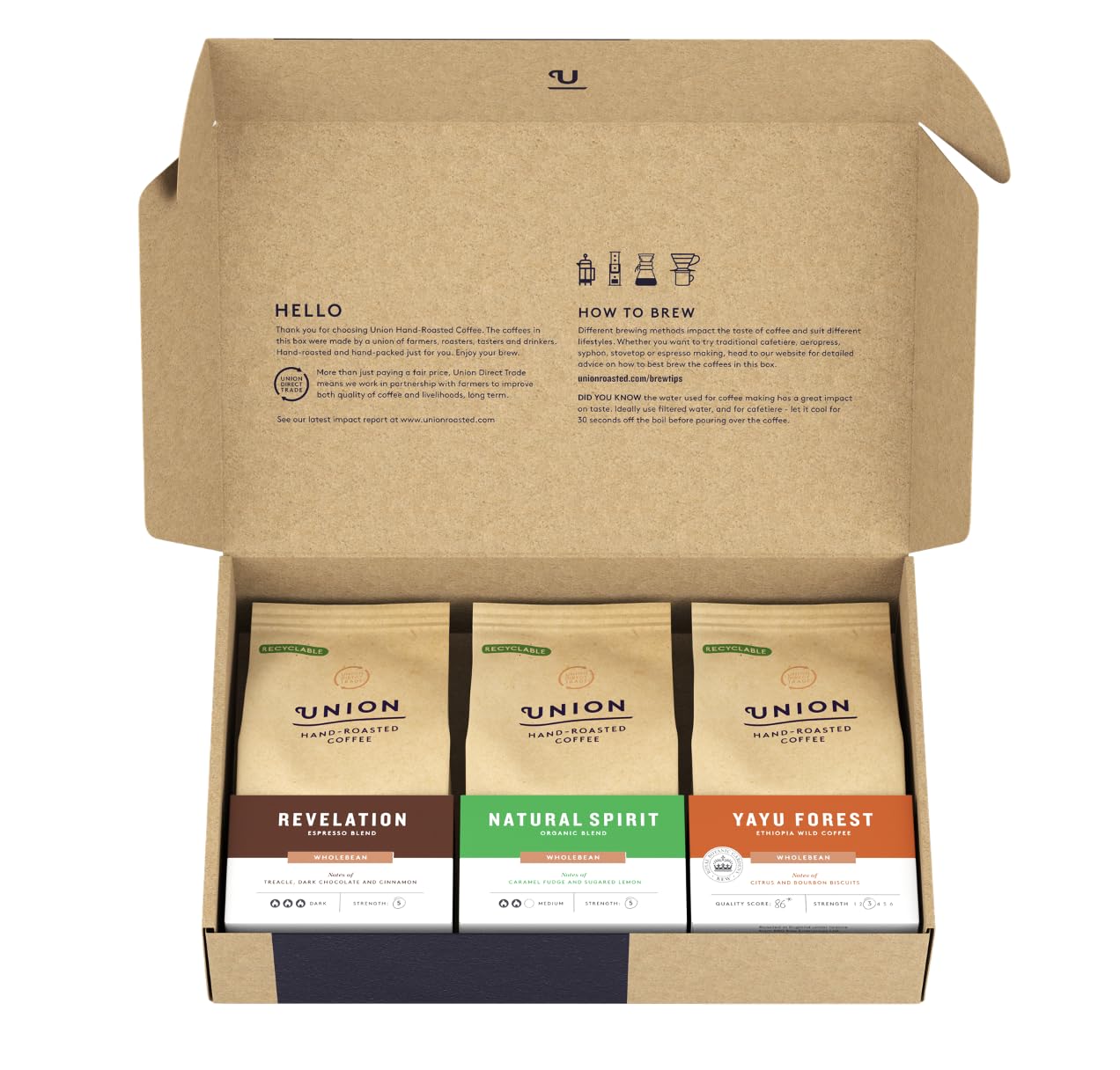 - Curated Coffee Selection: Includes three of Union's favorite whole bean coffees: Revelation blend, Organic Natural Spirit, and Wild Yayu Forest.