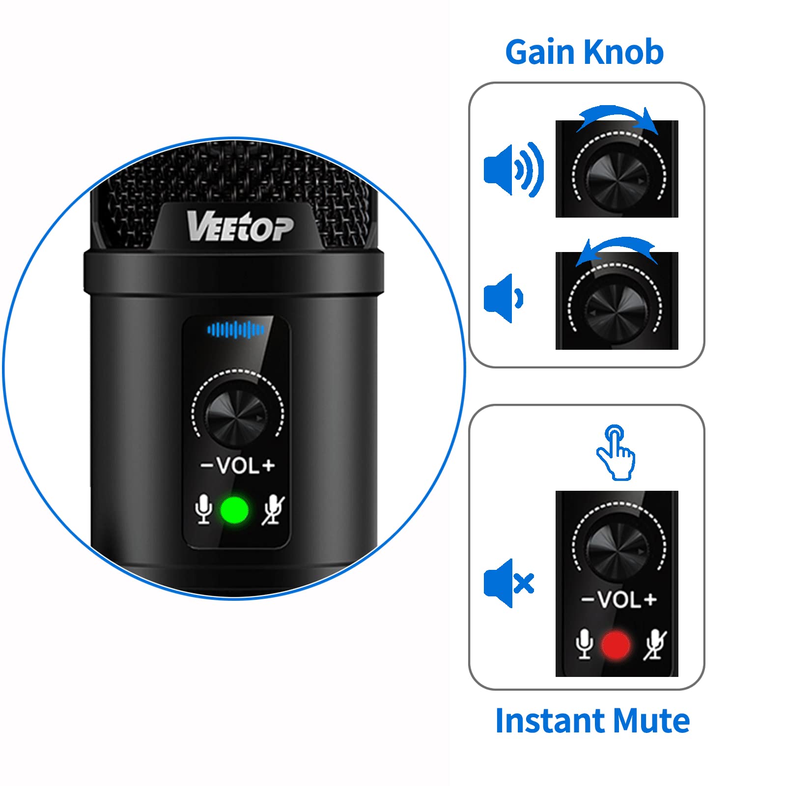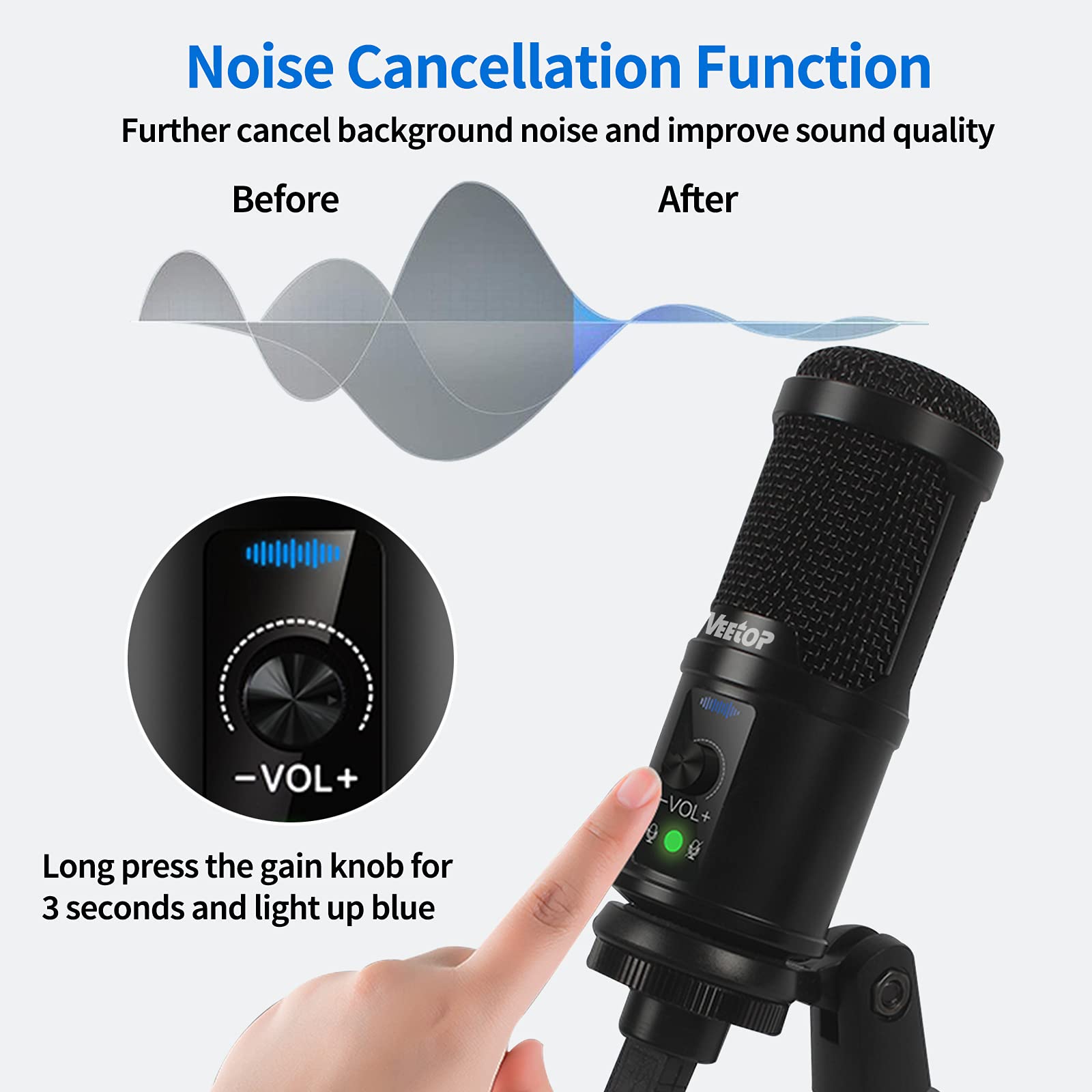 - Gain Knob with Mute and Noise Cancellation: Adjust the sensitivity for optimal sound and mute with ease using the knob. A 3-second press activates noise cancellation, improving clarity.