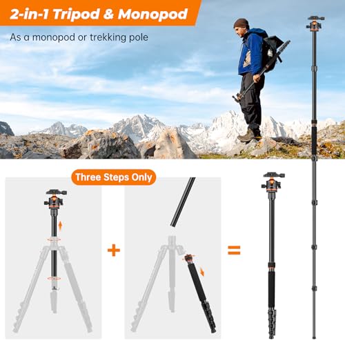 - 3-in-1 Portable Design: Easily transform the tripod into a monopod, with adjustable heights from 30.9"/78.5 cm to 81.4"/207 cm. This portability makes it a great companion for hiking, mountaineering, and traveling. The included sturdy carrying bag ensures hassle-free transport wherever you go.