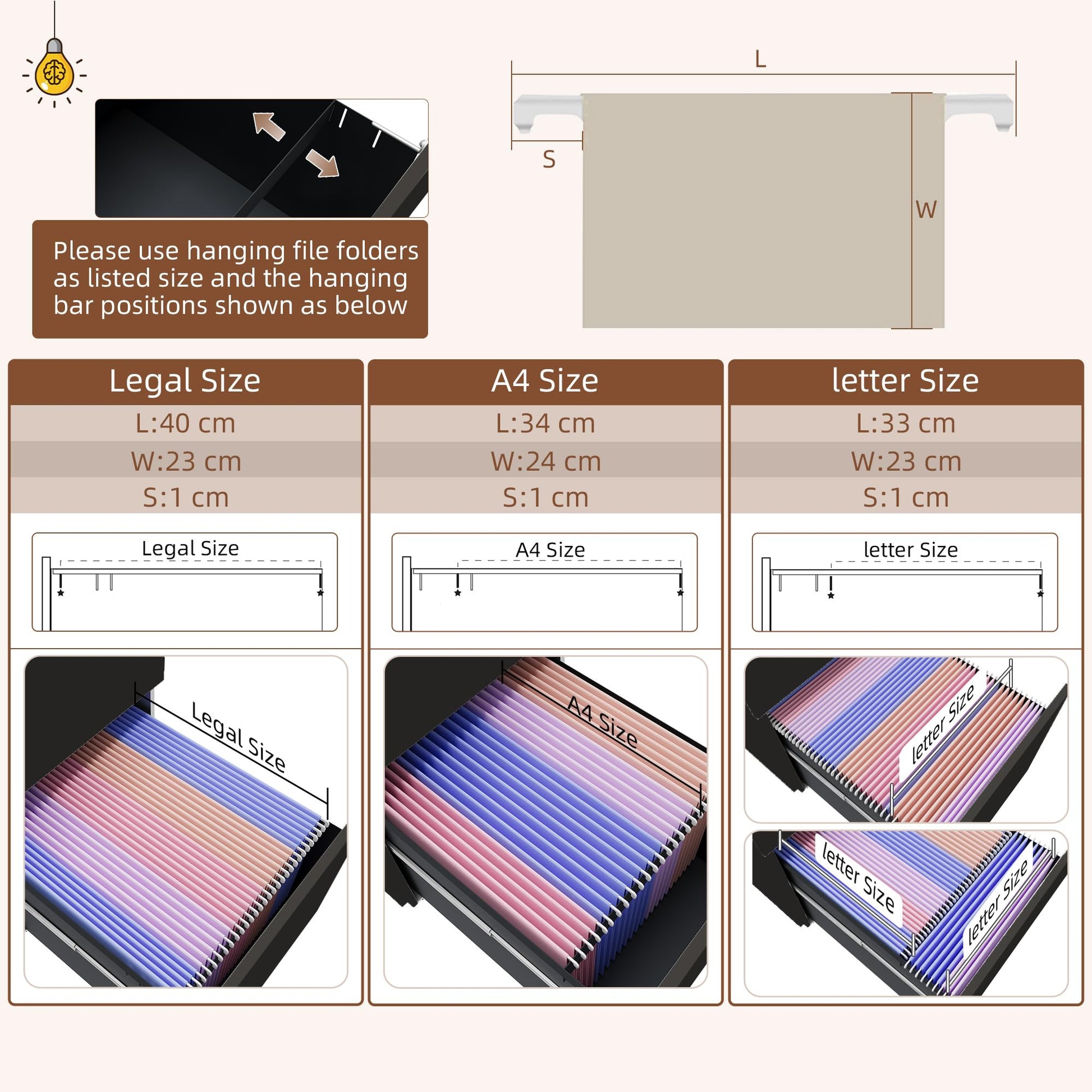 - Three Spacious Drawers: Each drawer measures 40.5 x 30.5 cm, with an adjustable bar for hanging letter, A4, and legal-sized files, providing versatile storage options.