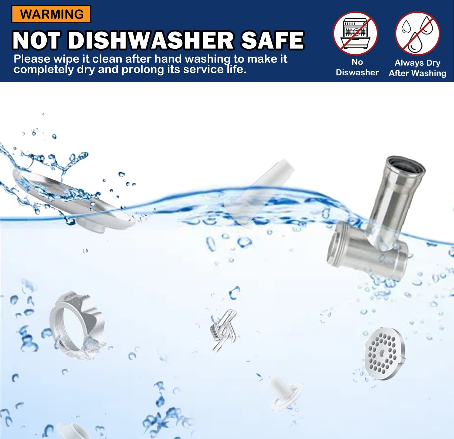 - Premium Attachments: Includes 3 cutting plates (fine, medium, coarse), 2 blades, a food pusher, kibbe attachments, and sausage accessories—crafted from food-grade stainless steel for durability and safety.