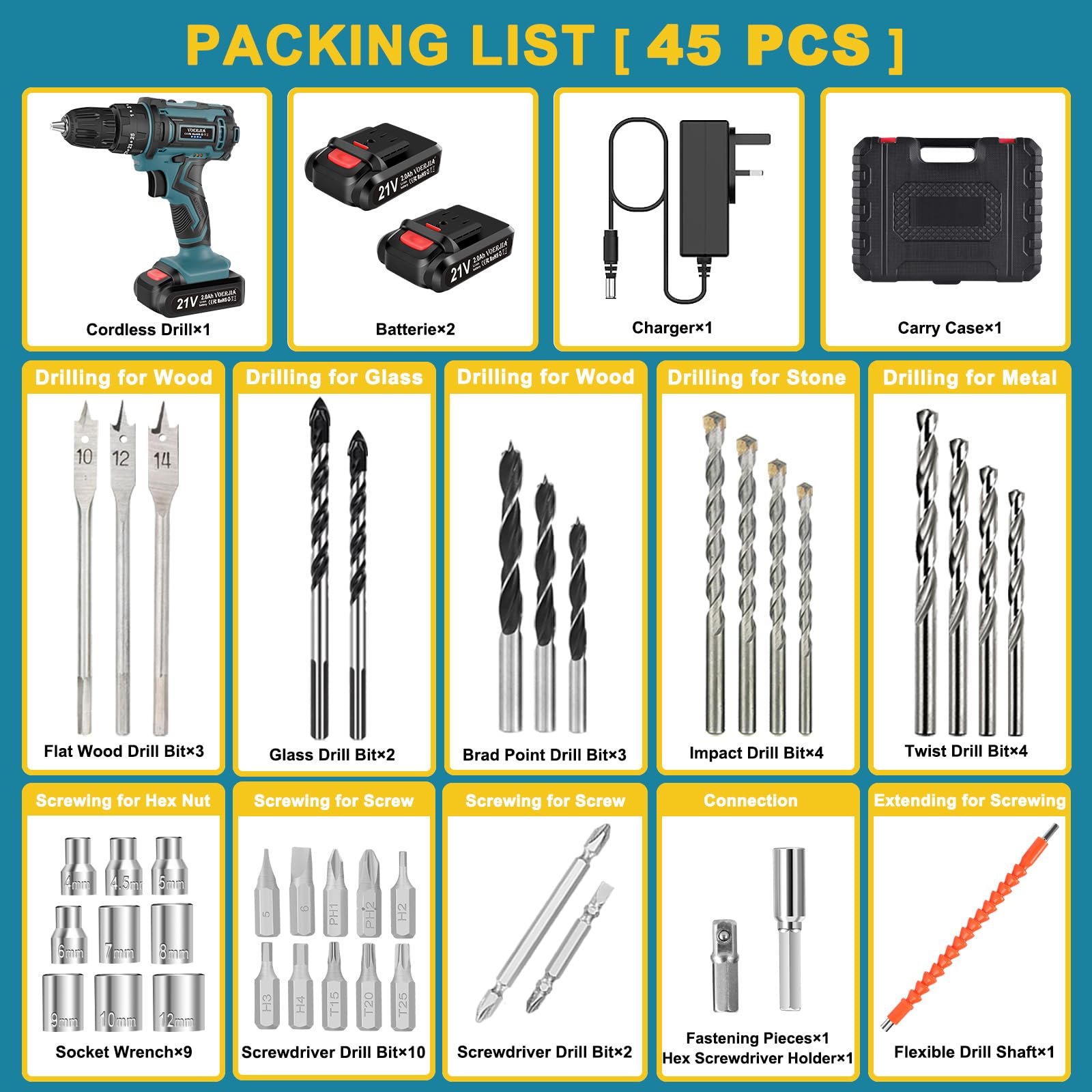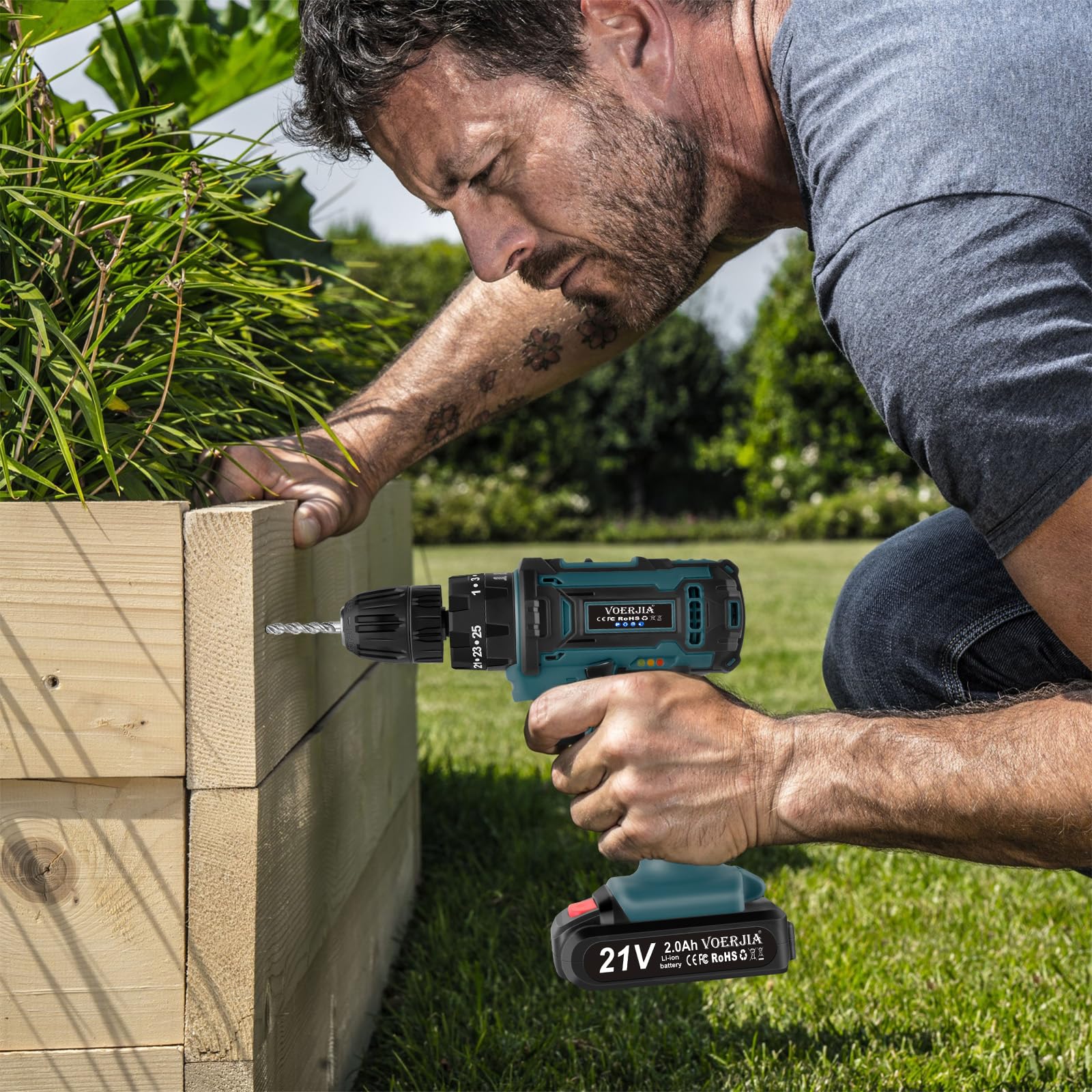 - VOERJIA 21V Cordless Drill, Power Drill Cordless, Cordless Drill with 2 Batteries 2000mAh -