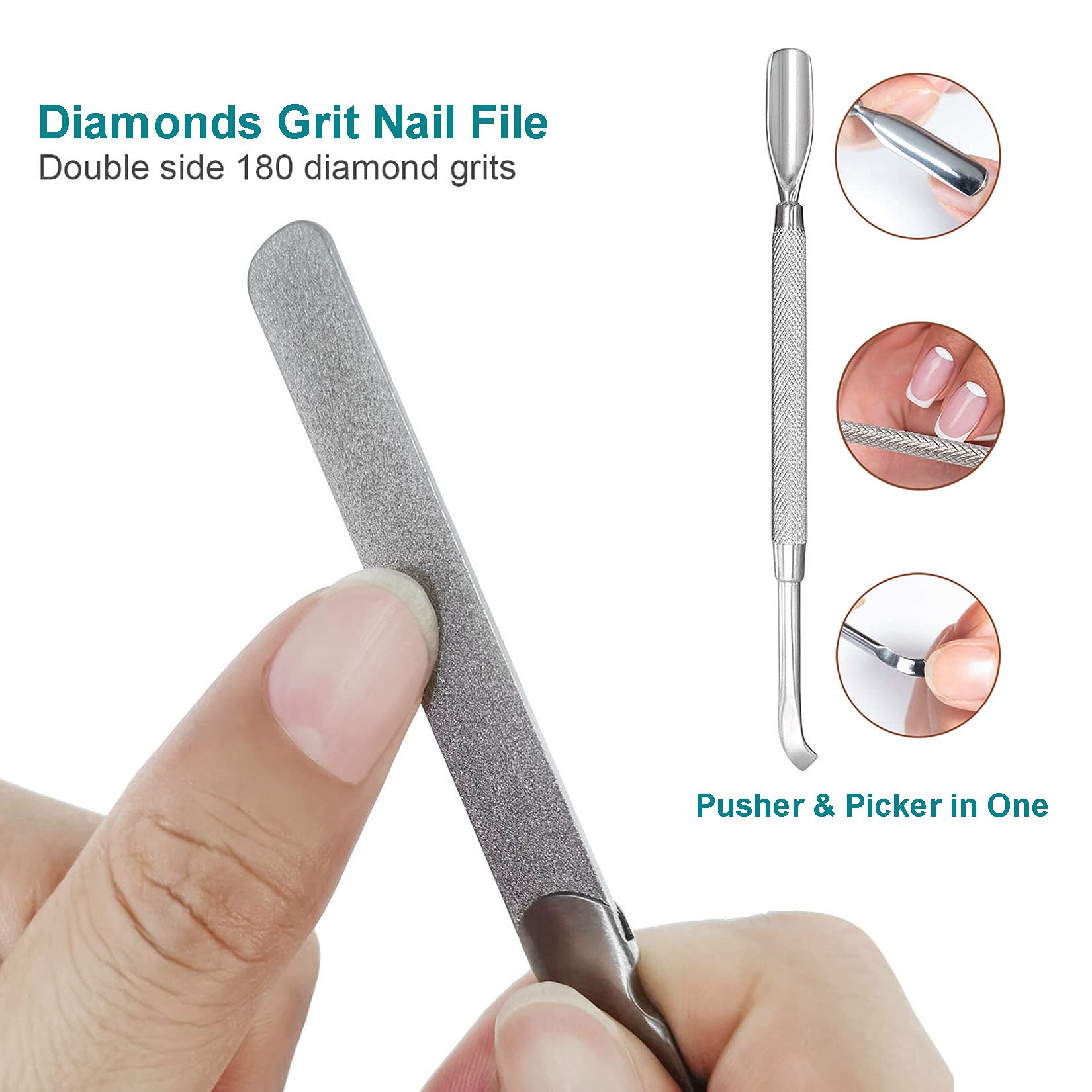 - Comprehensive 5-Piece Set: Includes everything you need for professional-level nail care—large toenail clipper, wide jaw nail clipper, nail file, pusher, and toenail corrector, all housed in a protective case for easy storage.