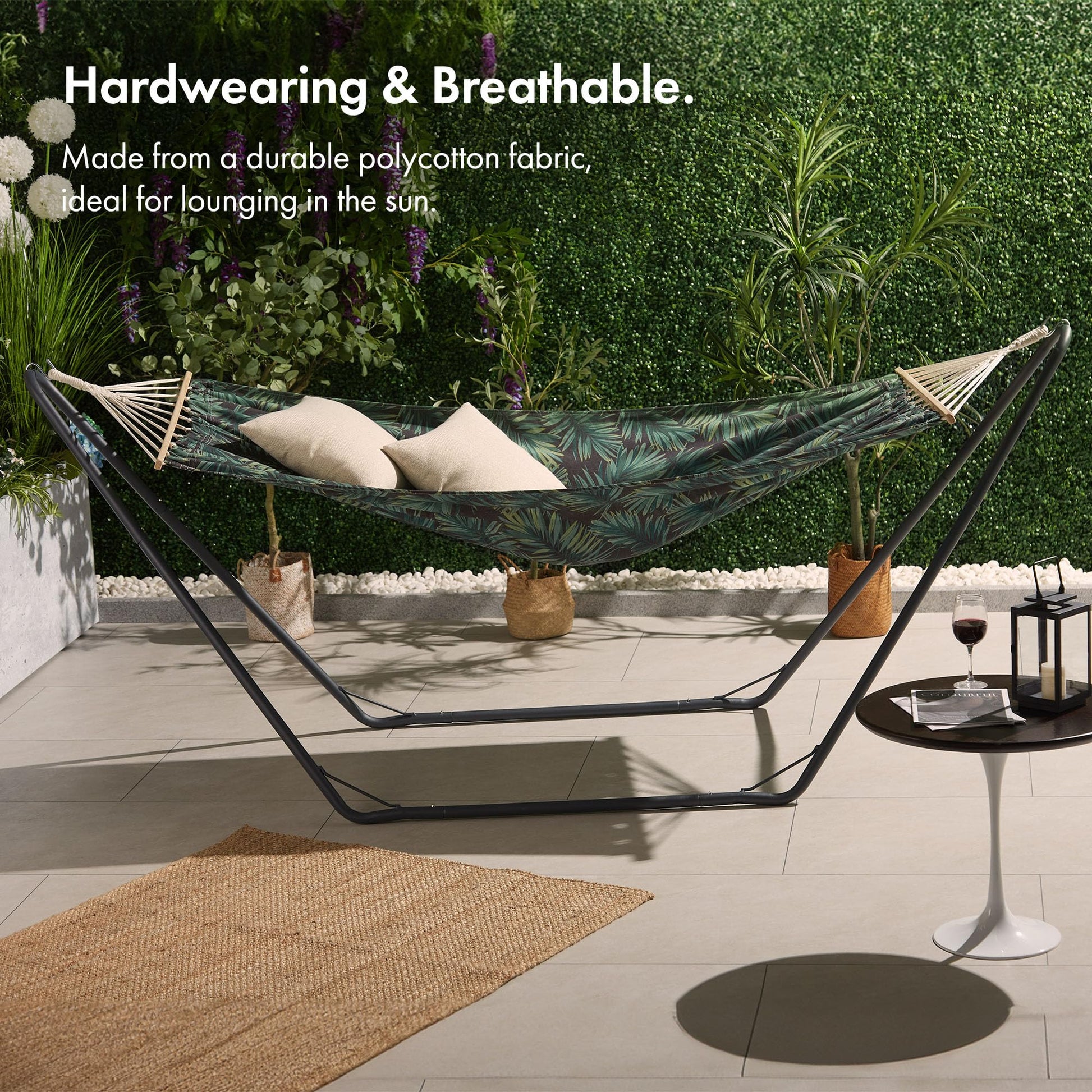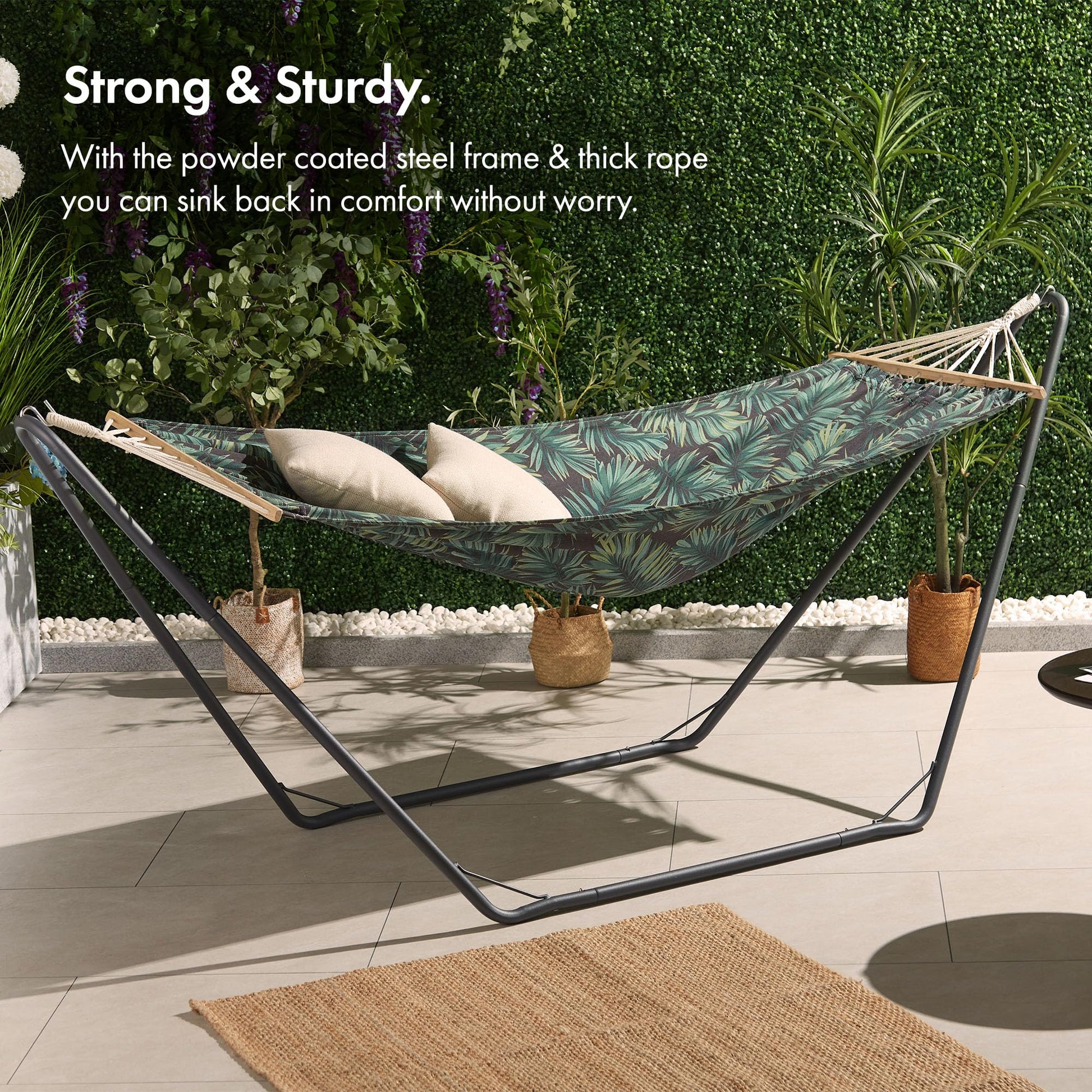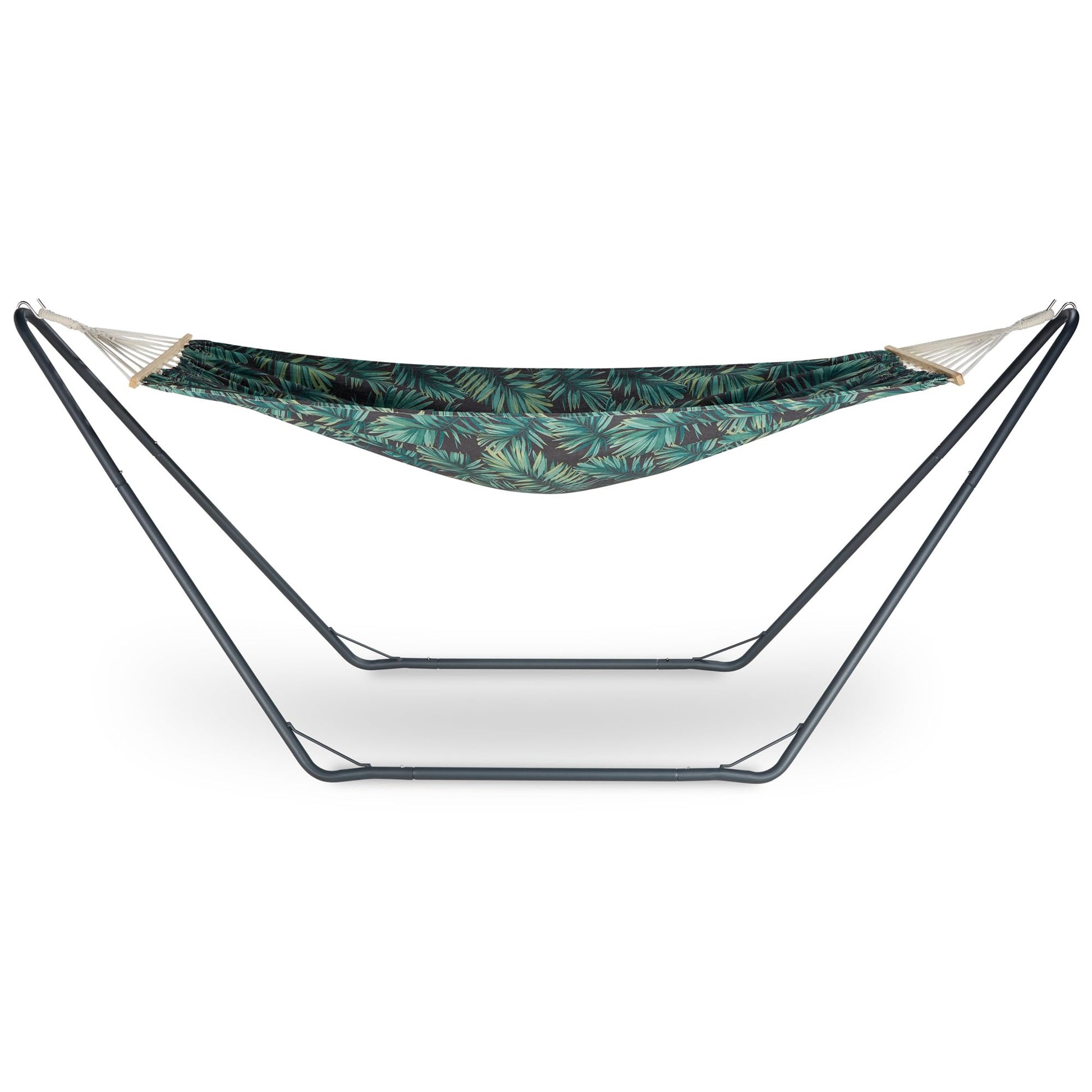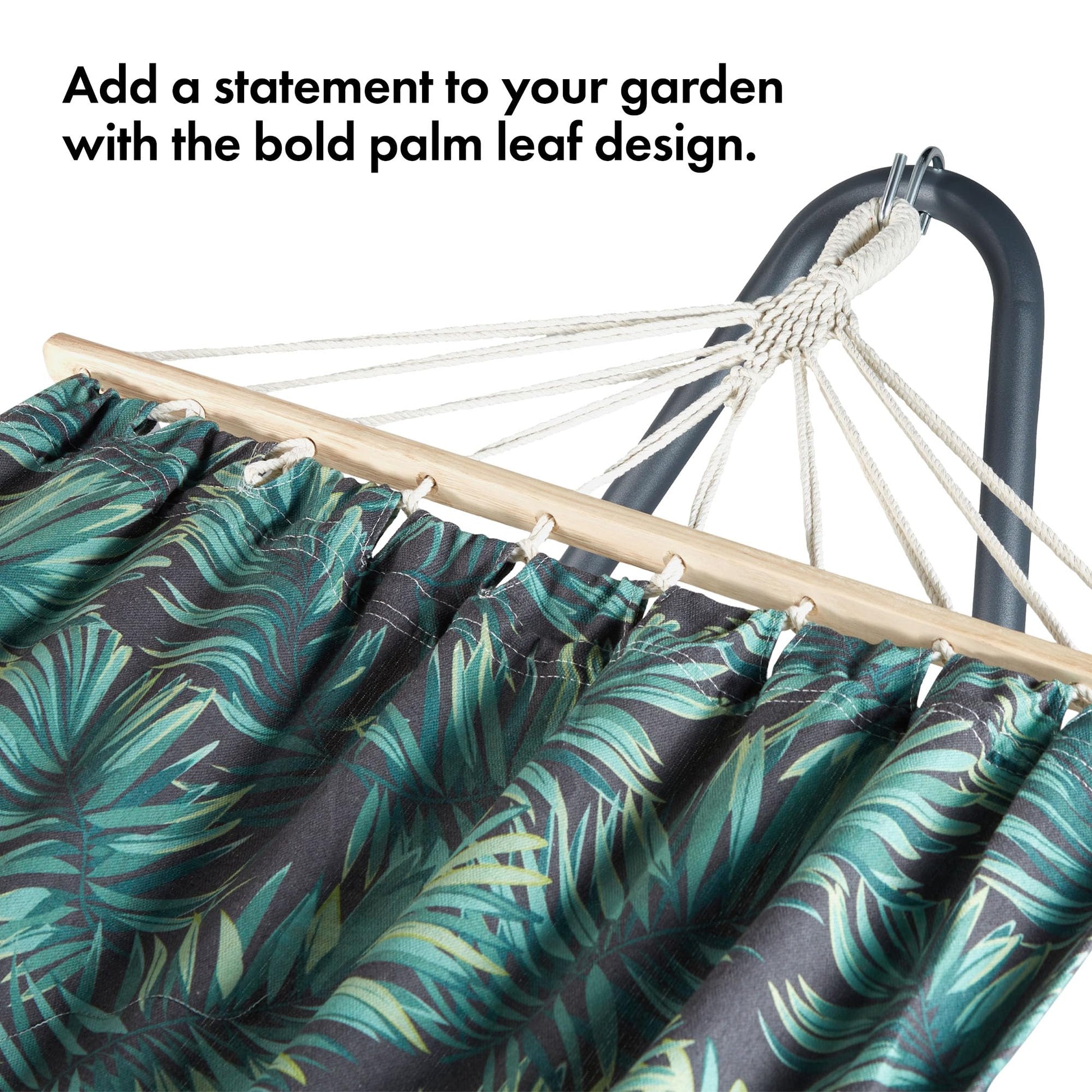- Material: Cotton blend hammock, powder-coated steel frame, and wooden spreader bars