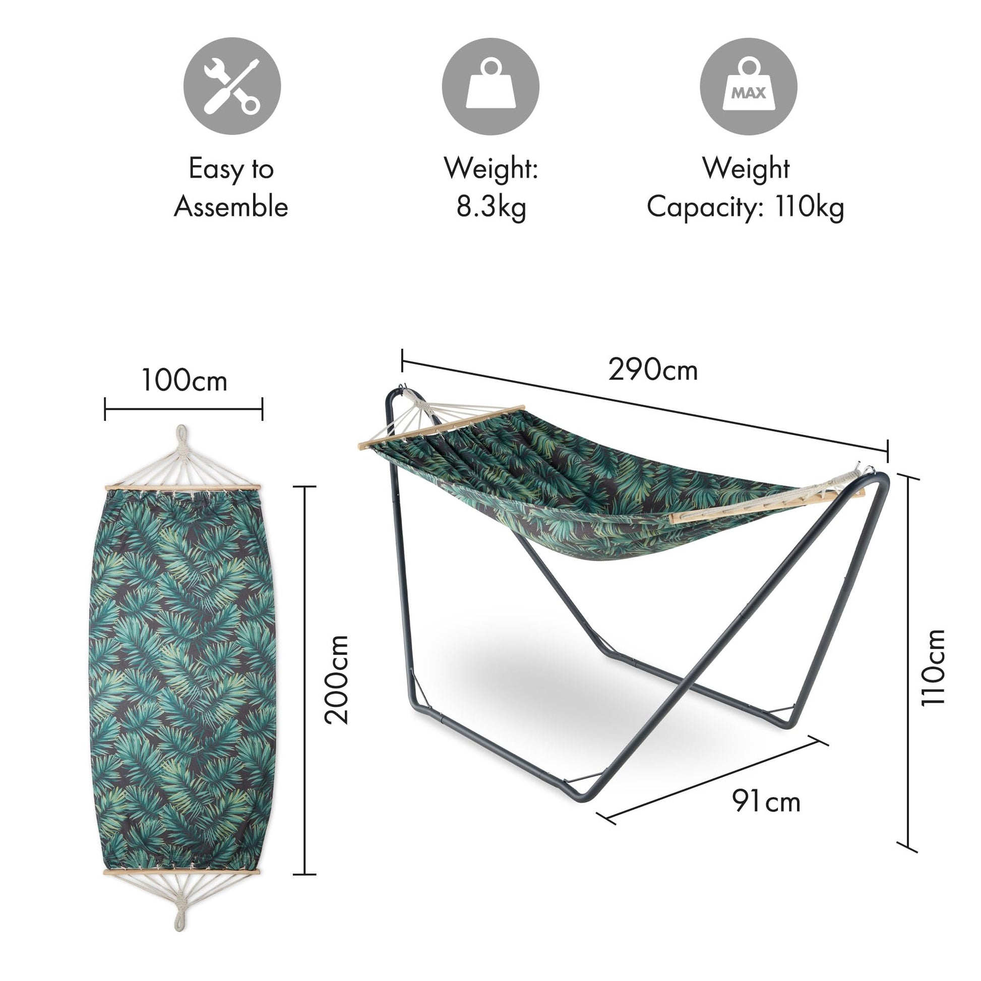 - Spacious Design: At H110 x W290 x D91cm, the hammock provides plenty of space to sway and relax in comfort.