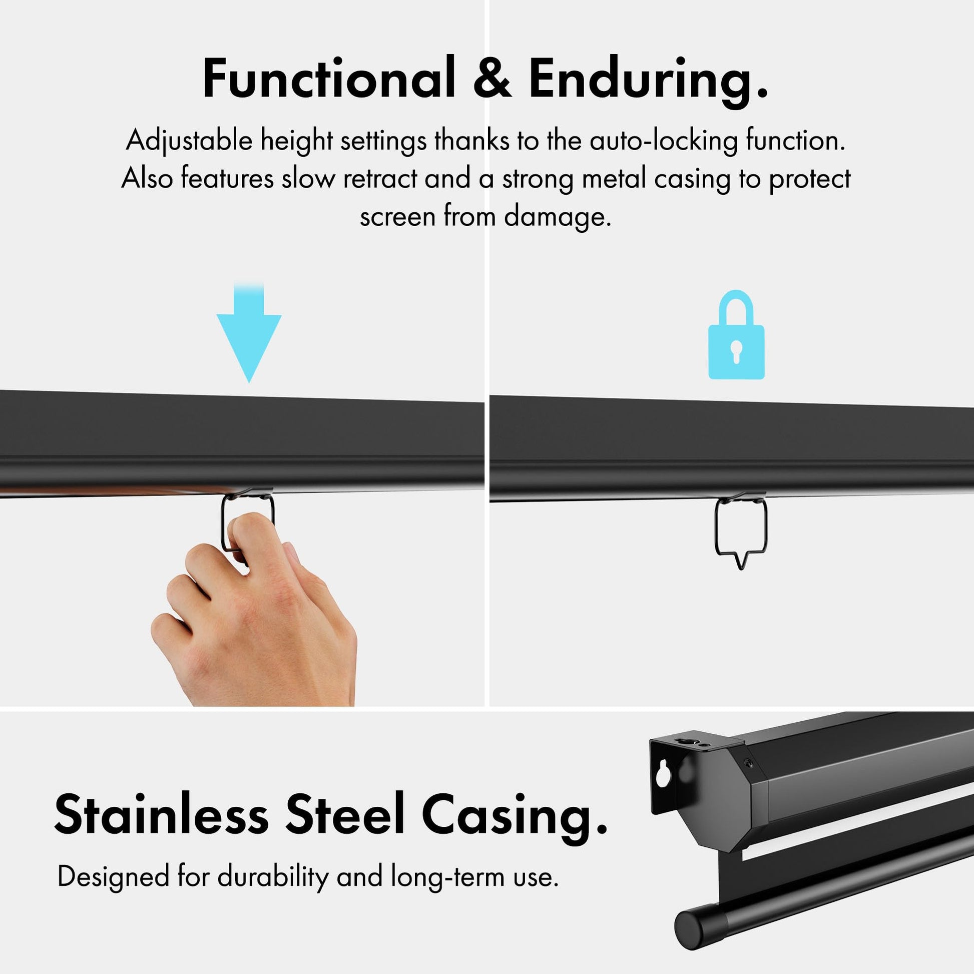 - Wall or Ceiling Mountable: Adapt the screen to your space with flexible mounting options. Full instructions for both wall and ceiling mounting are included for quick installation.
