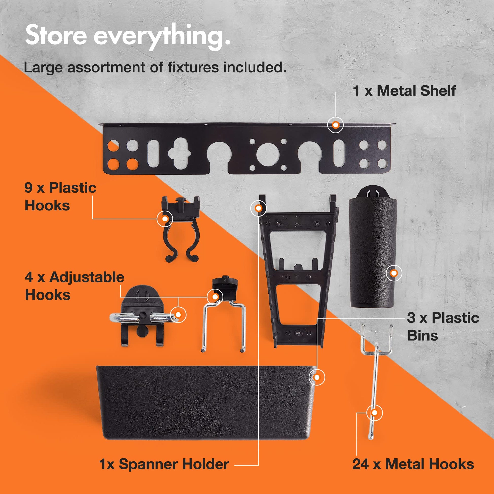 - Organise Your Tools: The tool board comes with 42 attachments, including 24 metal hooks, 4 adjustable hooks, 9 plastic hooks, 3 plastic bins, a metal shelf, and a spanner holder, giving you plenty of options to organize your tools.