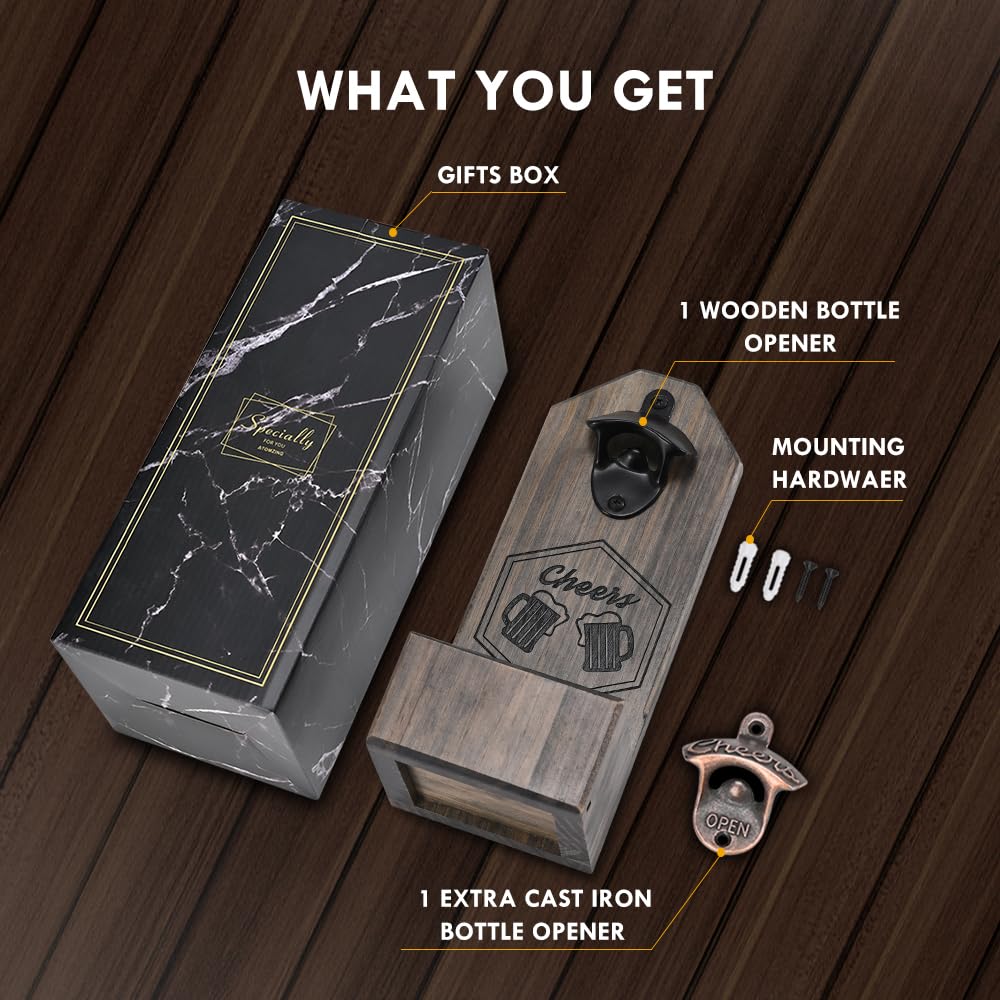 - Simple Installation: Includes screws for easy wall mounting on various surfaces like brick, cement, or wood. An extra bottle opener is also included for convenience.