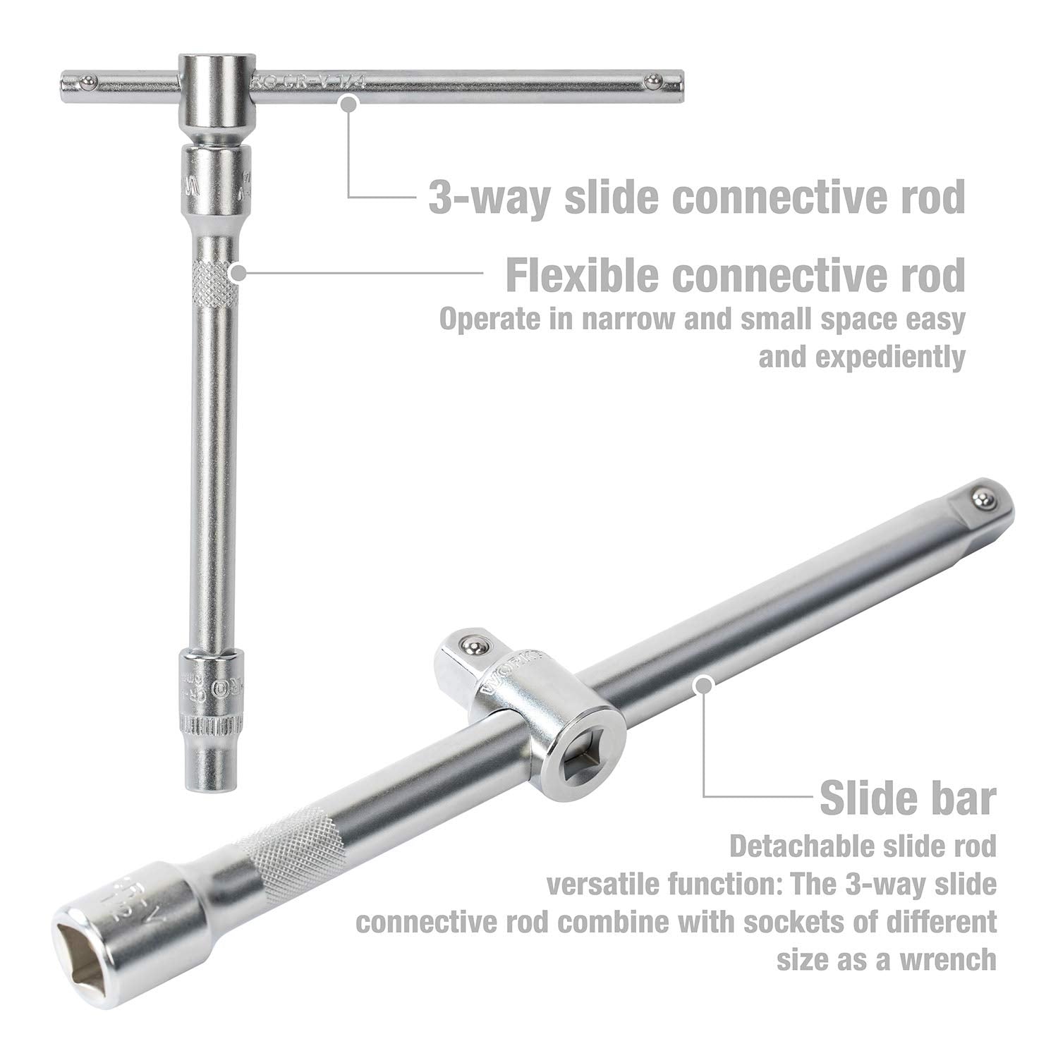 - 3PC 72-Teeth Reversible Ratchet Handles: Equipped with three ratchet handles (1/4", 3/8", and 1/2"), this set allows for smooth, efficient operation with a 72-teeth mechanism for superior grip and ease of use. The quick-release button makes it easy to switch between sockets.