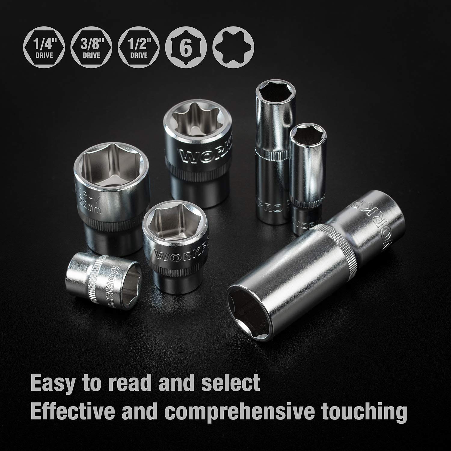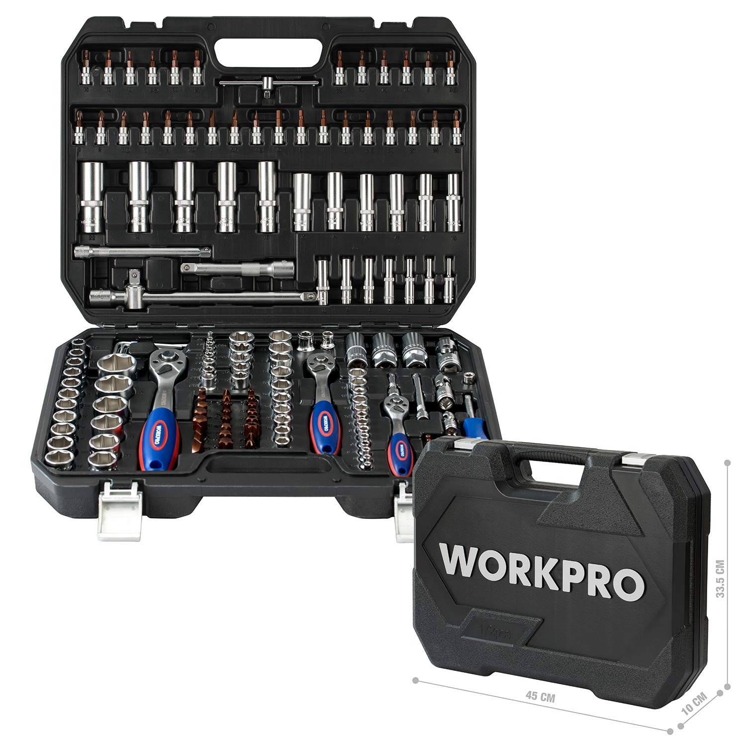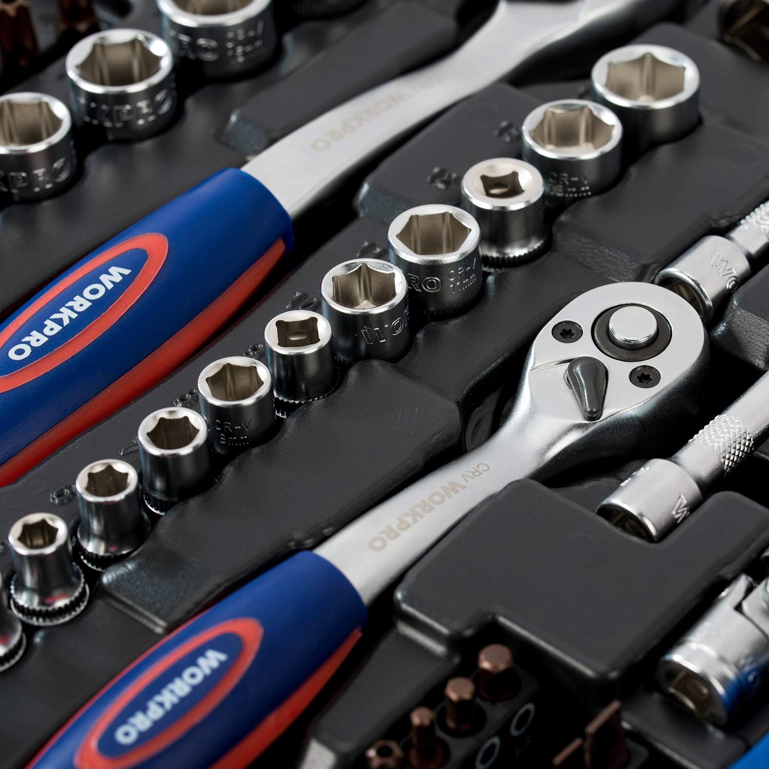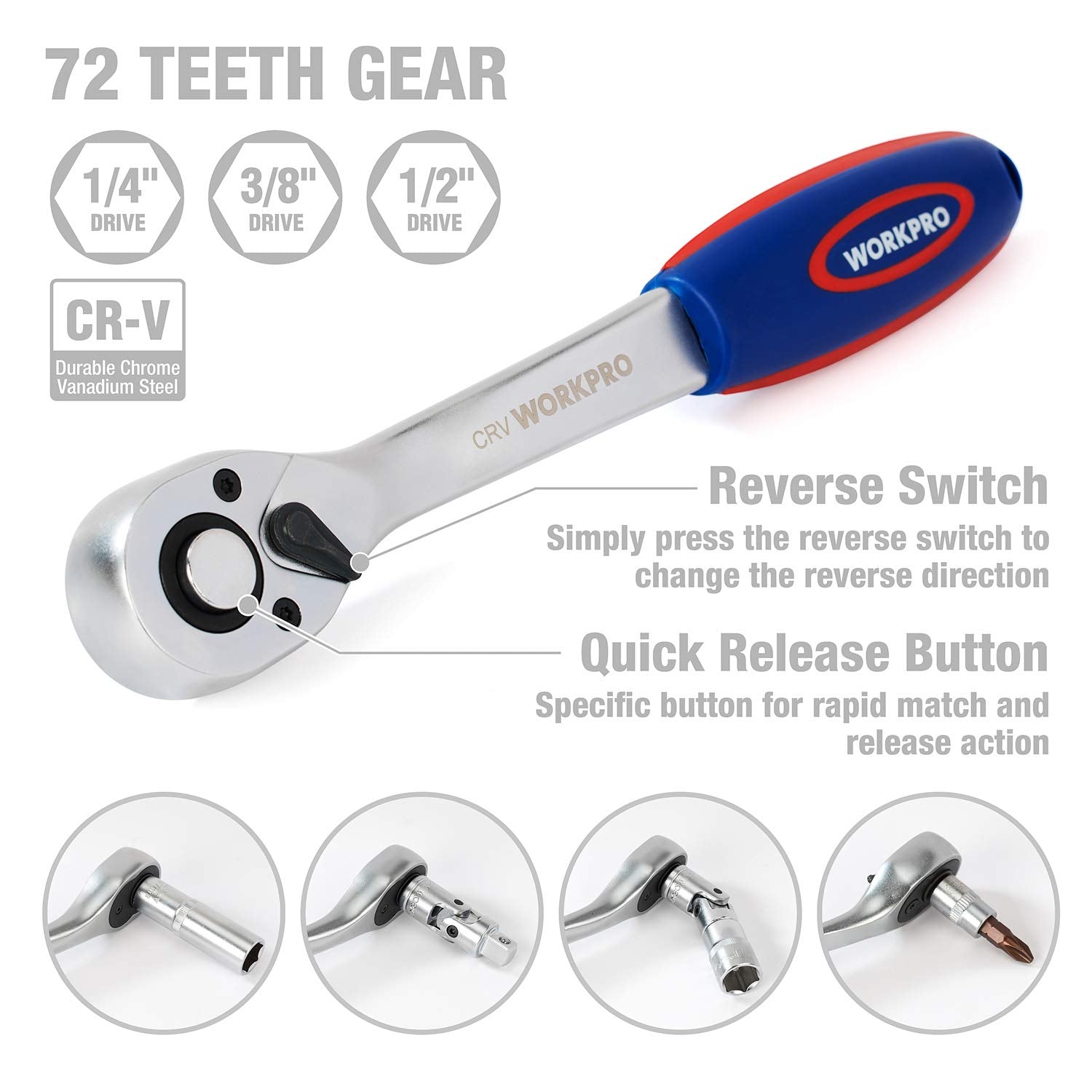 - WORKPRO 172-Piece Socket Set 1/2" 3/8" 1/4" Drive, Cr-V Metric Sockets with 72-Teeth Quick Release Ratchet Handle, Extension Bar & Universal Joints, Useful for Car Repairs, Professionals, Mechanics