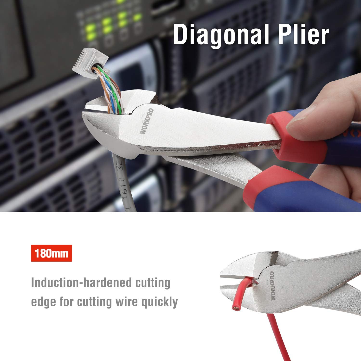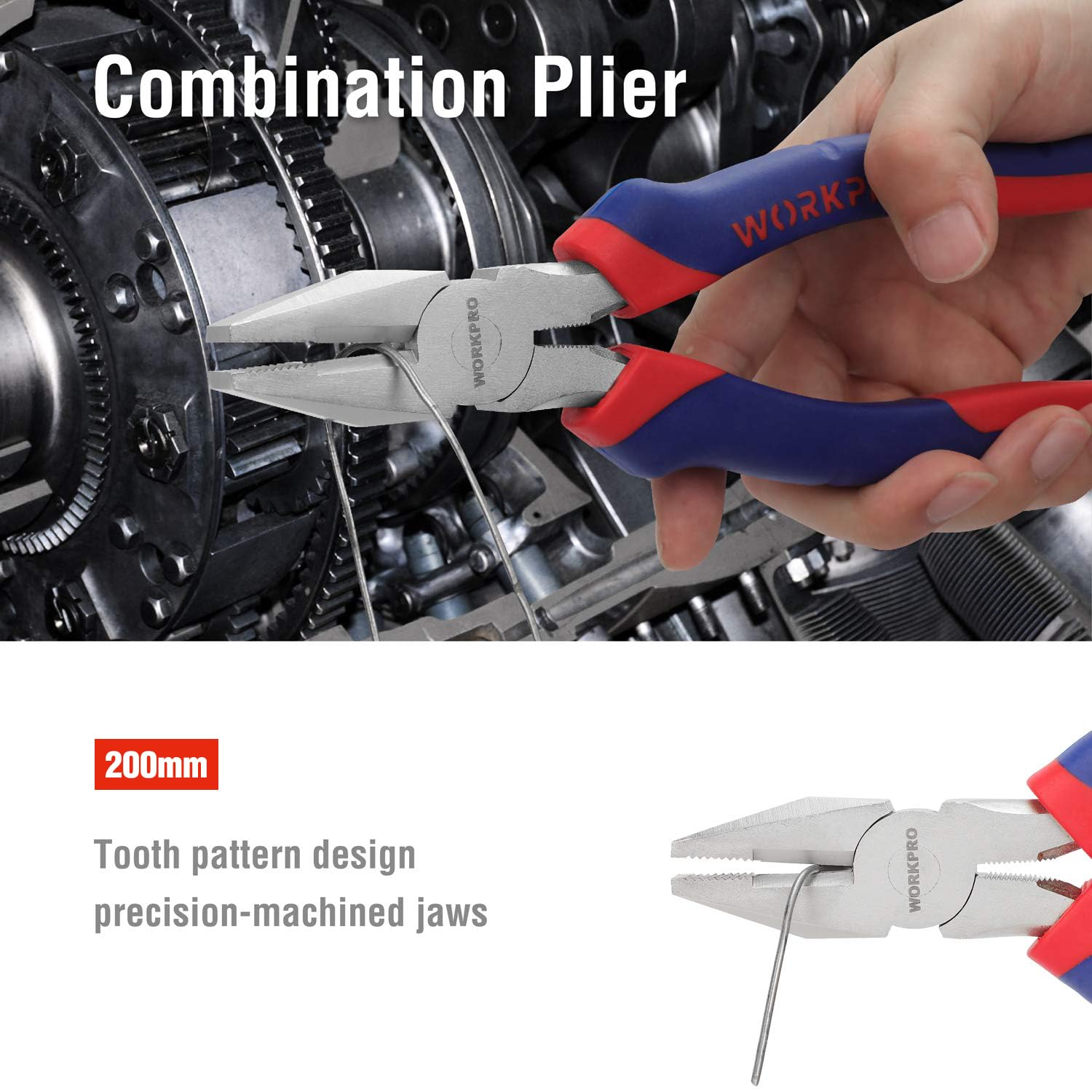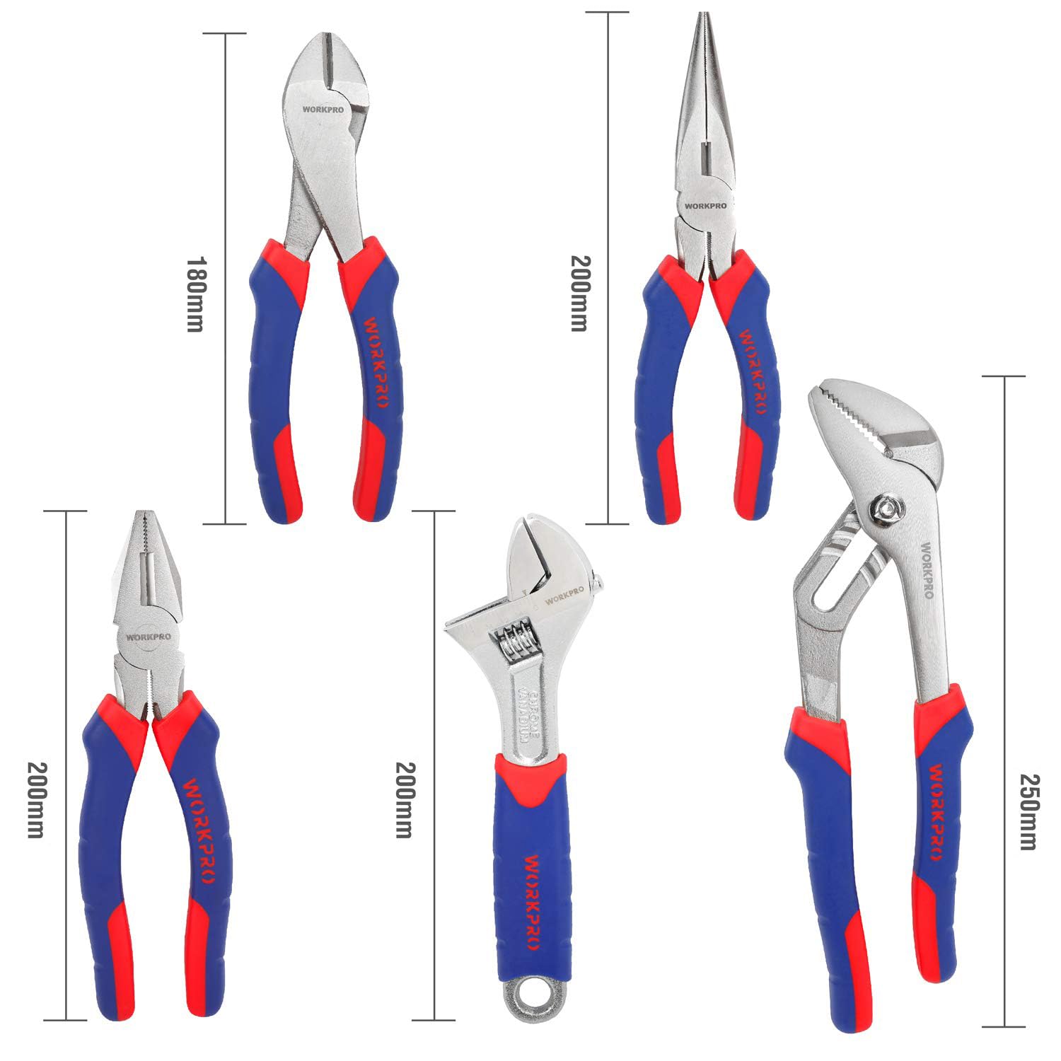 - WORKPRO 5-Piece Pliers Set, Includes 250nn Water Pump Plier, 200mm Combination Plier, 200mm Long Nose Plier, 180mm Diagonal Cutter, 200mm Adjustable Wrench, with Soft Grip Handles