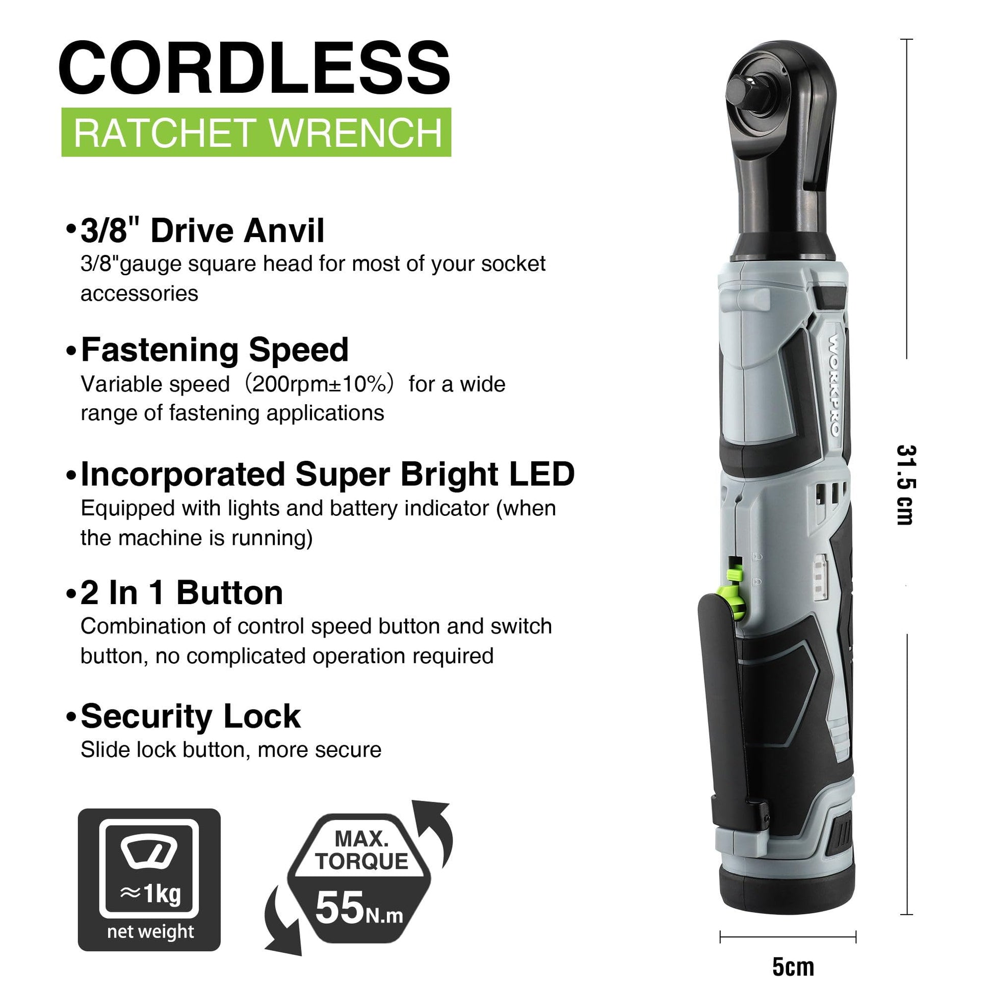 - Max Torque and Speed: Delivers 55Nm of torque and 200 RPM, providing powerful and quick results for all your ratcheting needs.