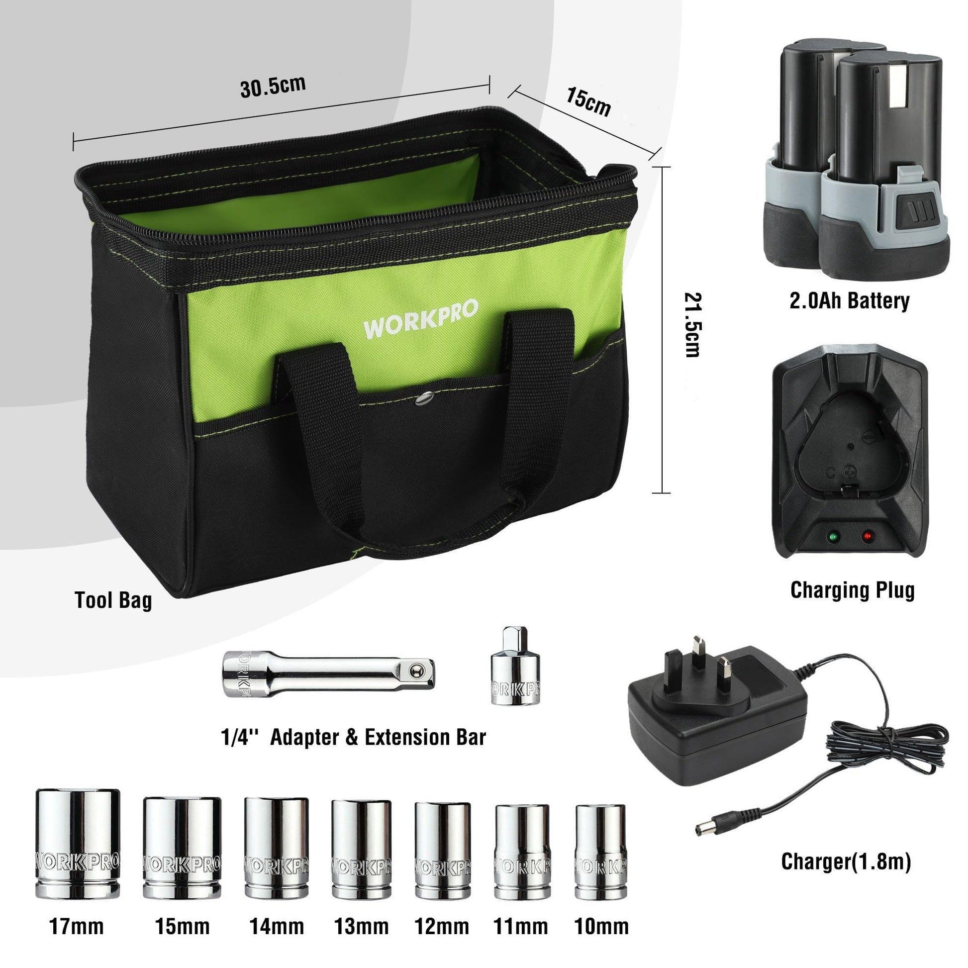 - 2.0Ah Li-ion Battery & Fast Charger: Equipped with 2 x 12V 2.0Ah batteries and a quick charger, this set allows you to work efficiently and stay powered up, with a full charge in just 1 hour.
