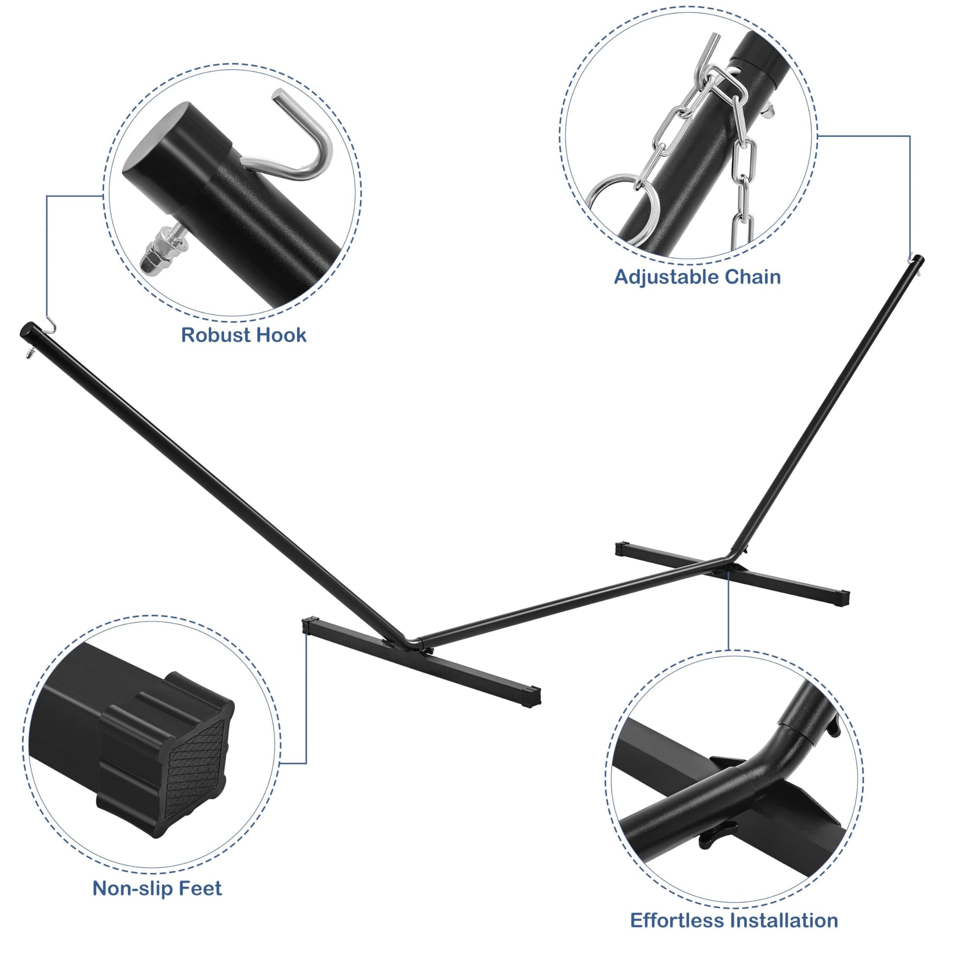 - Extra-stable Support: The hammock stand is constructed from durable iron tubes and features a unique inverted trapezoid structure with extended legs. This design ensures an even weight distribution and provides extra stability, allowing you to relax with confidence.