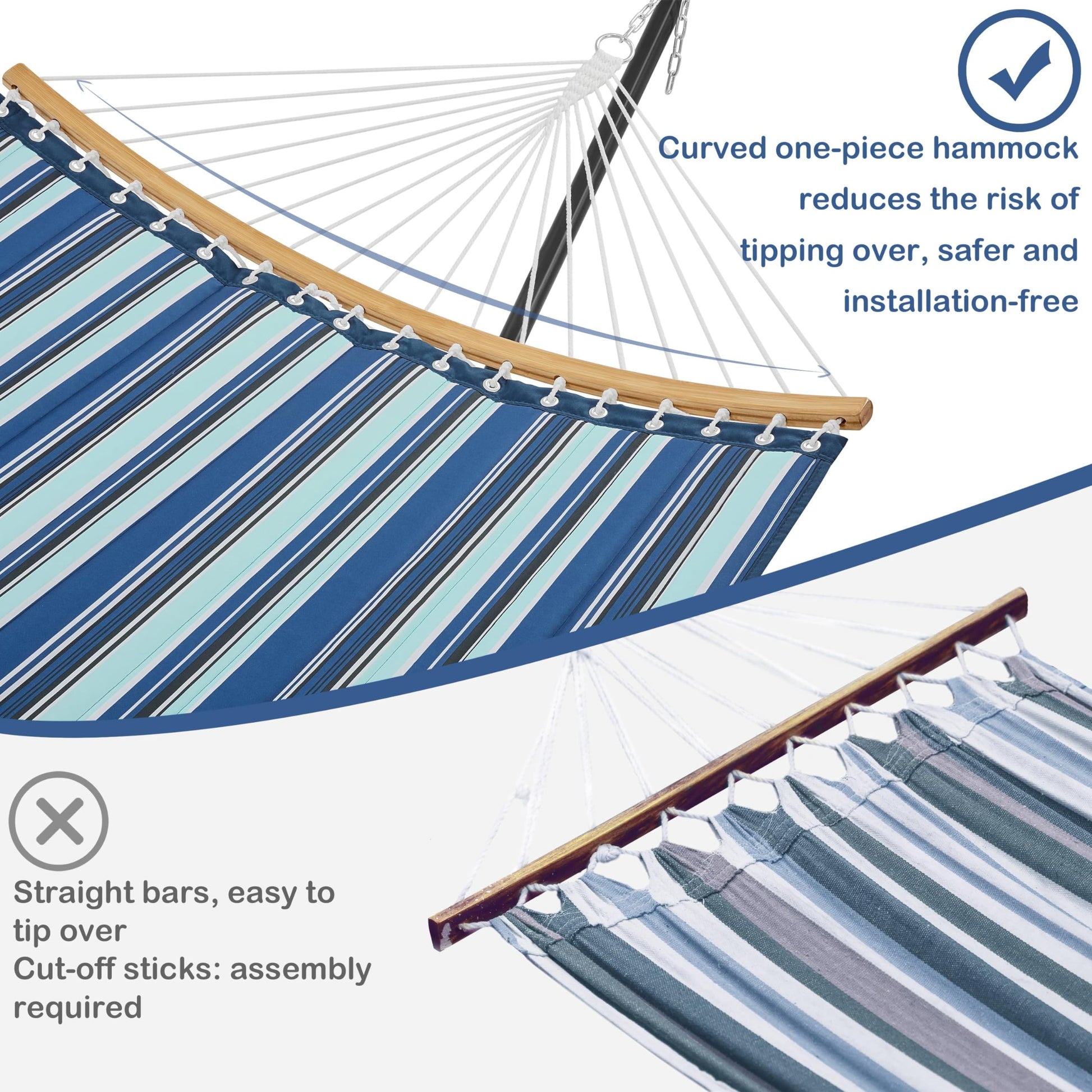 - Padded & Skin-friendly Hammock: Made from 100% 170g polyester cover with polyester wadding filling, this hammock offers outstanding weather resistance, breathability, and elasticity. Its soft, skin-friendly texture ensures comfort for long hours of relaxation.