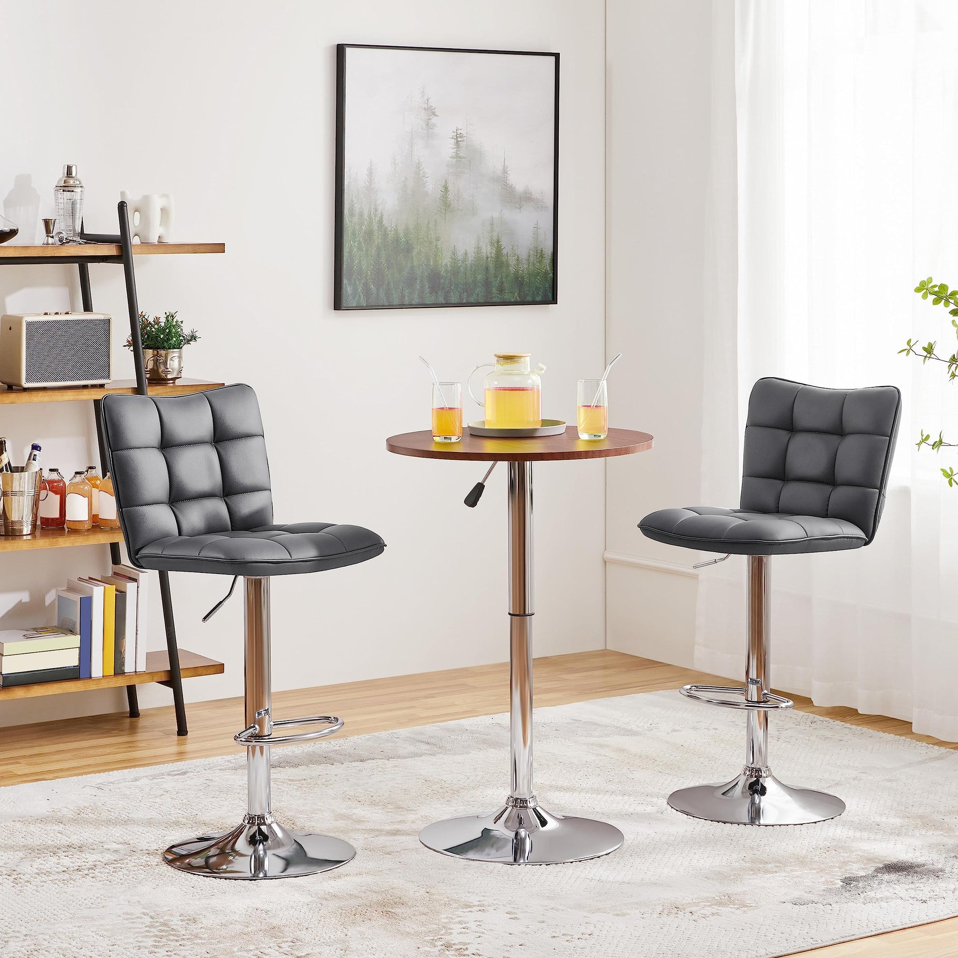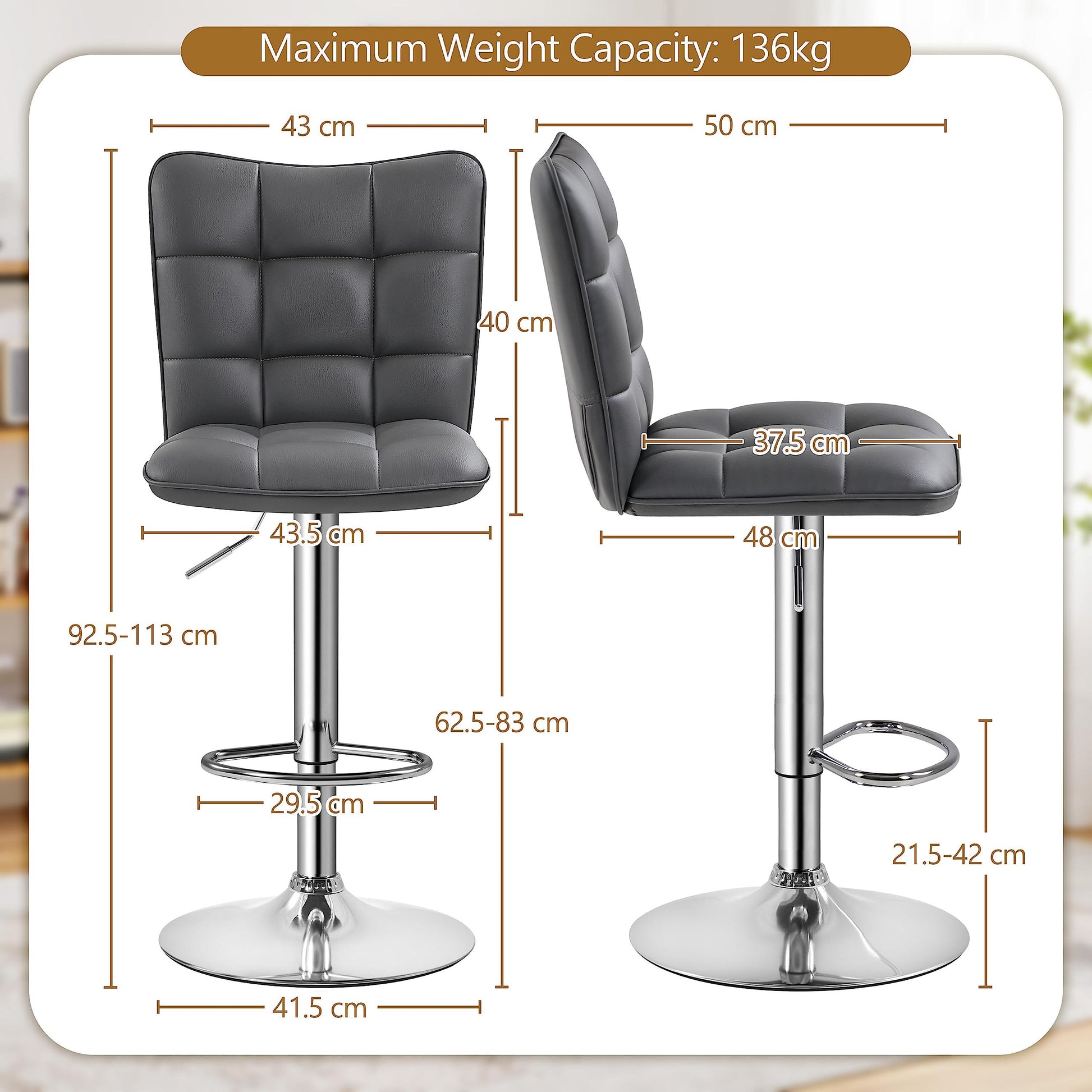 - Height-adjustable Stools: The stools come with a gas lift mechanism, certified by SGS, allowing you to adjust the seat height from 62.5 cm (24.6”) to 83 cm (32.7”) effortlessly. This feature makes it easy to accommodate different seating needs and heights.