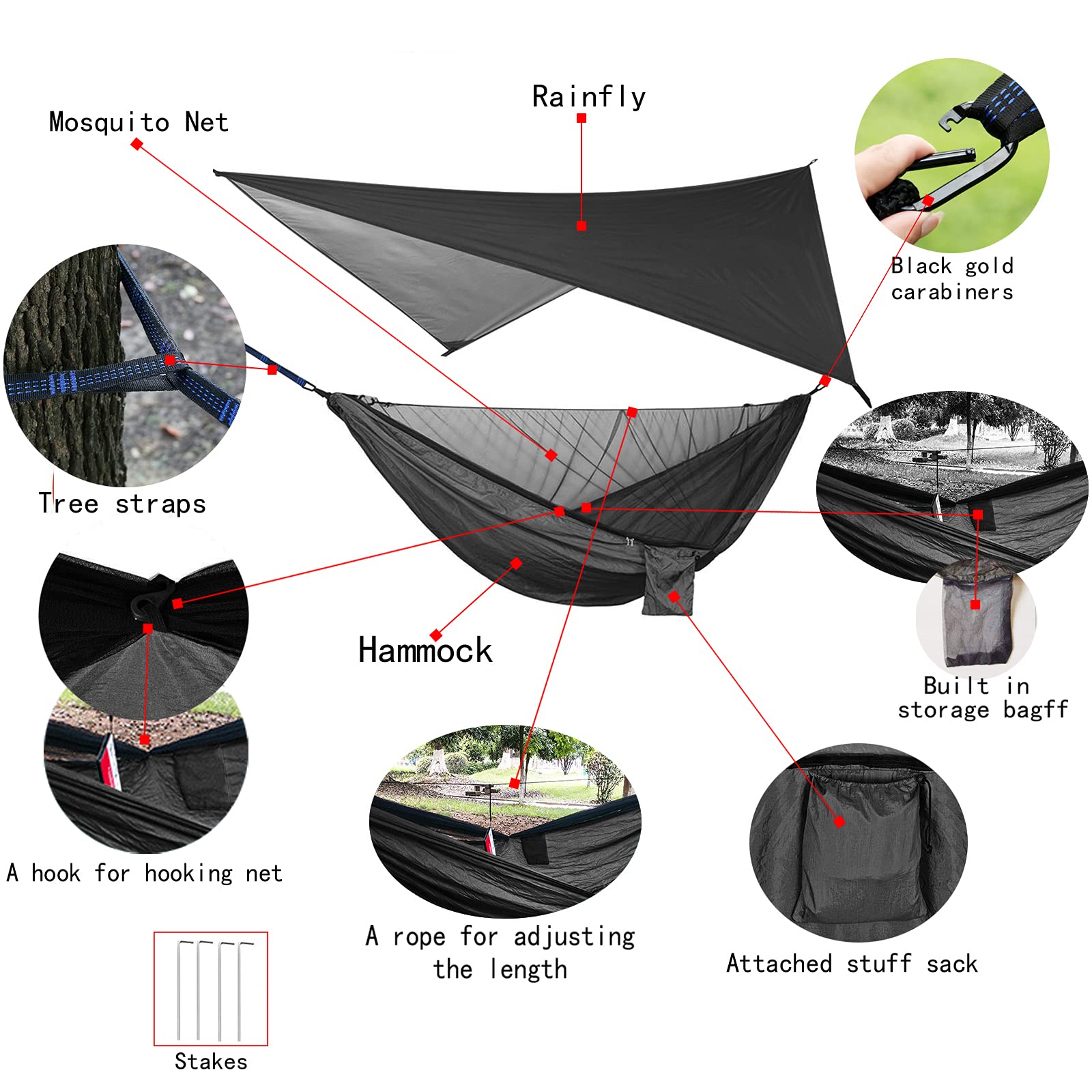 - Includes a hammock, mosquito net, rainproof tarp, tree belts, steel carabiners, stakes, and ropes—everything you need for a hassle-free outdoor experience.