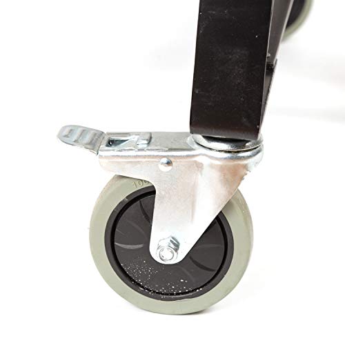- Ergonomic Stand with Lockable Wheels: Includes a black powder-coated trolley with four lockable wheels for stability and portability.