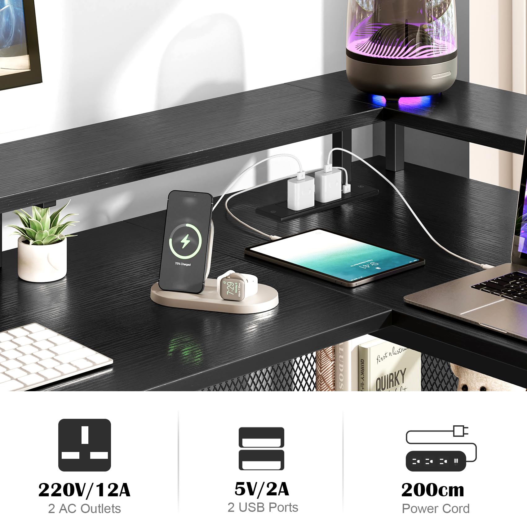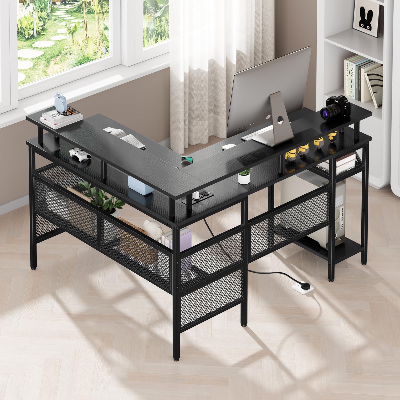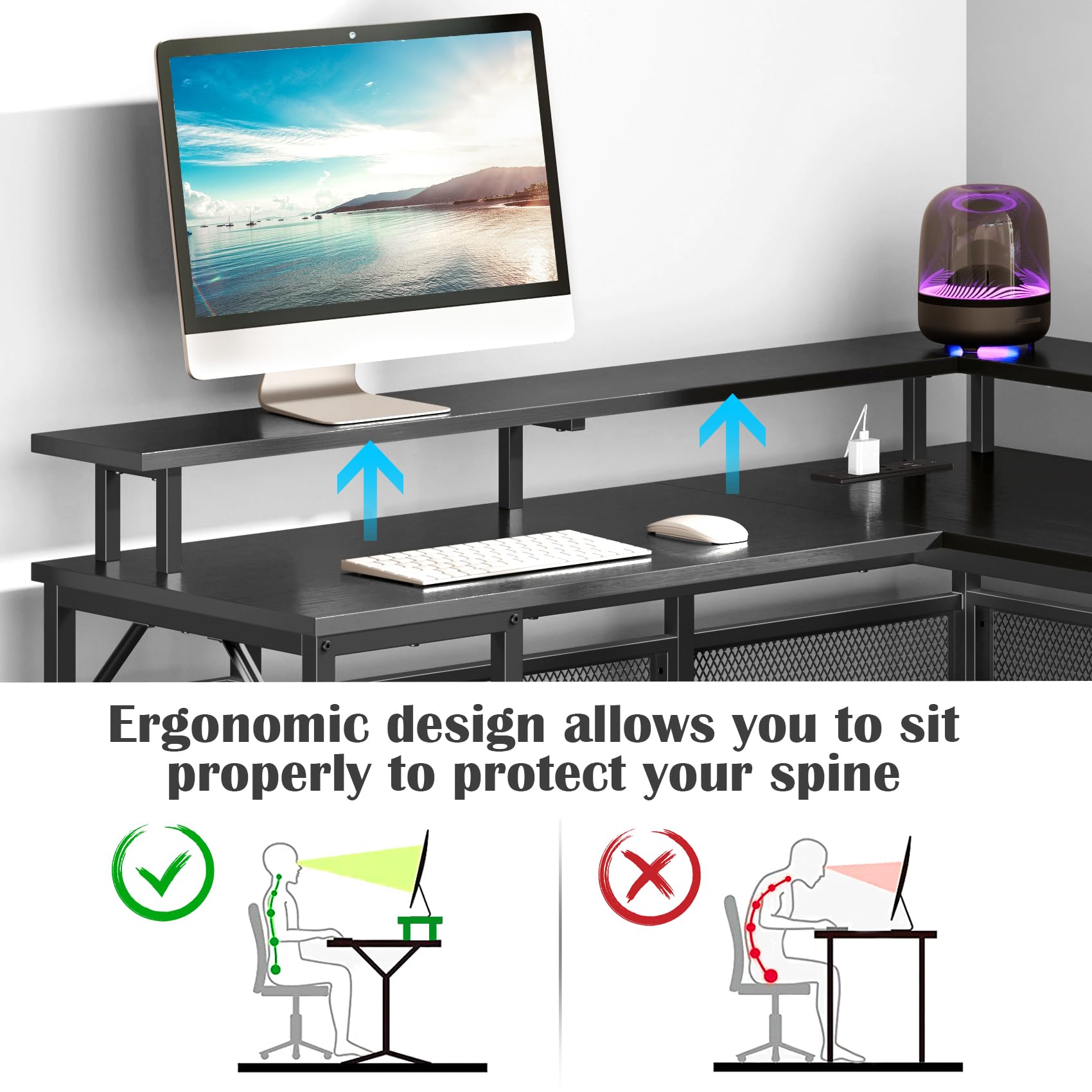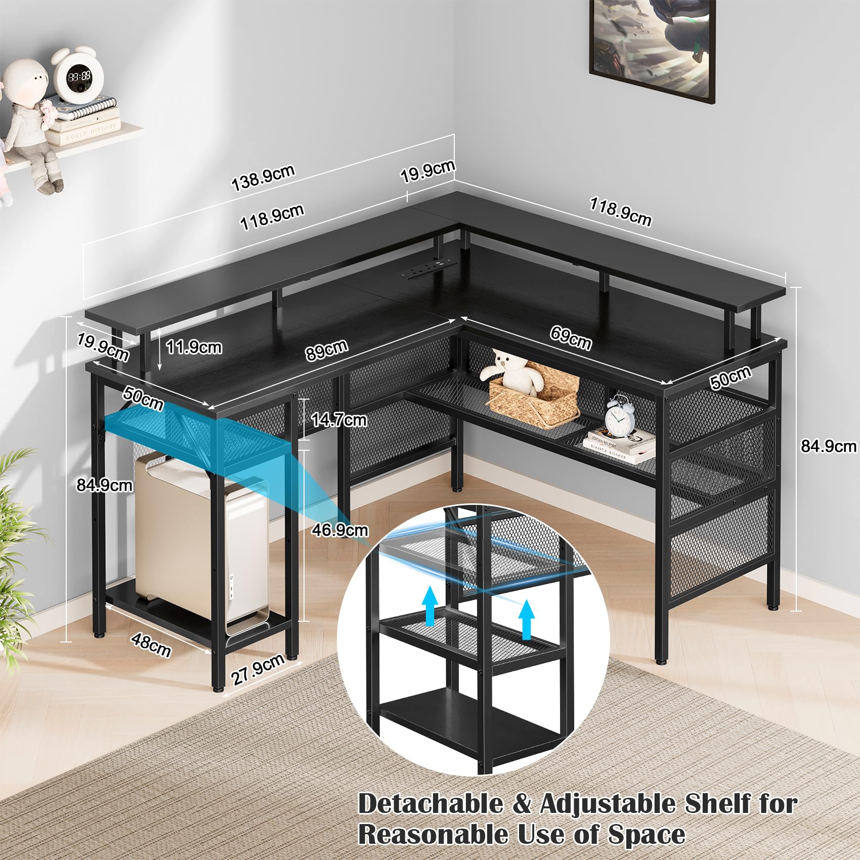 - Ample Space & Storage: With a desktop size of 140cm (L) x 120cm (W) x 85cm (H), this L-shaped desk offers plenty of room for 2-4 monitors, keyboards, and other essentials. Additional storage comes from sturdy metal mesh shelves, keeping everything organized and within reach.