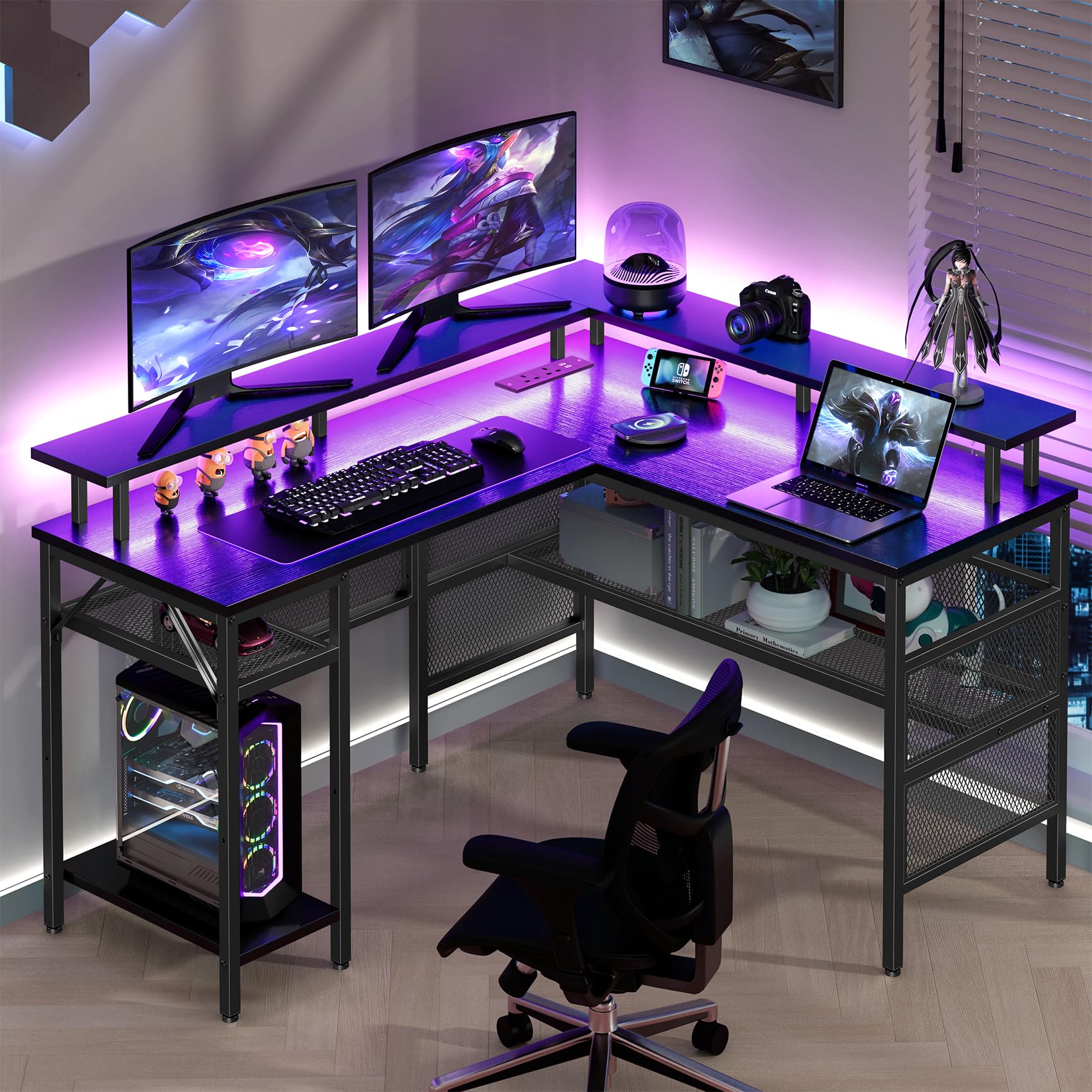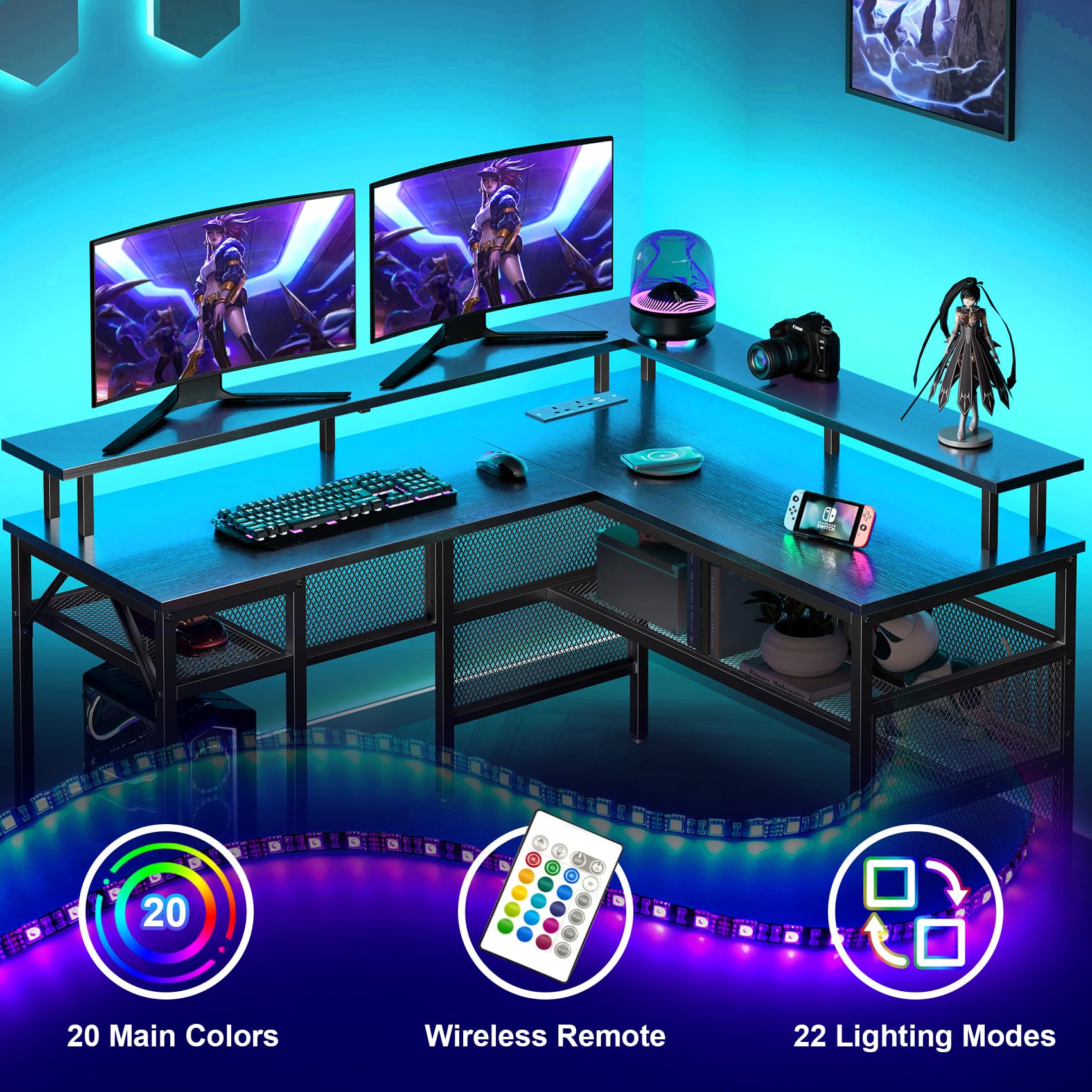 -Yornoli L Shaped Gaming Desk with Led Lights&Power Outlet, 140cm Corner Gaming Desk for Home Office Computer Desk with Monitor Stand & Storage Shelves, Black