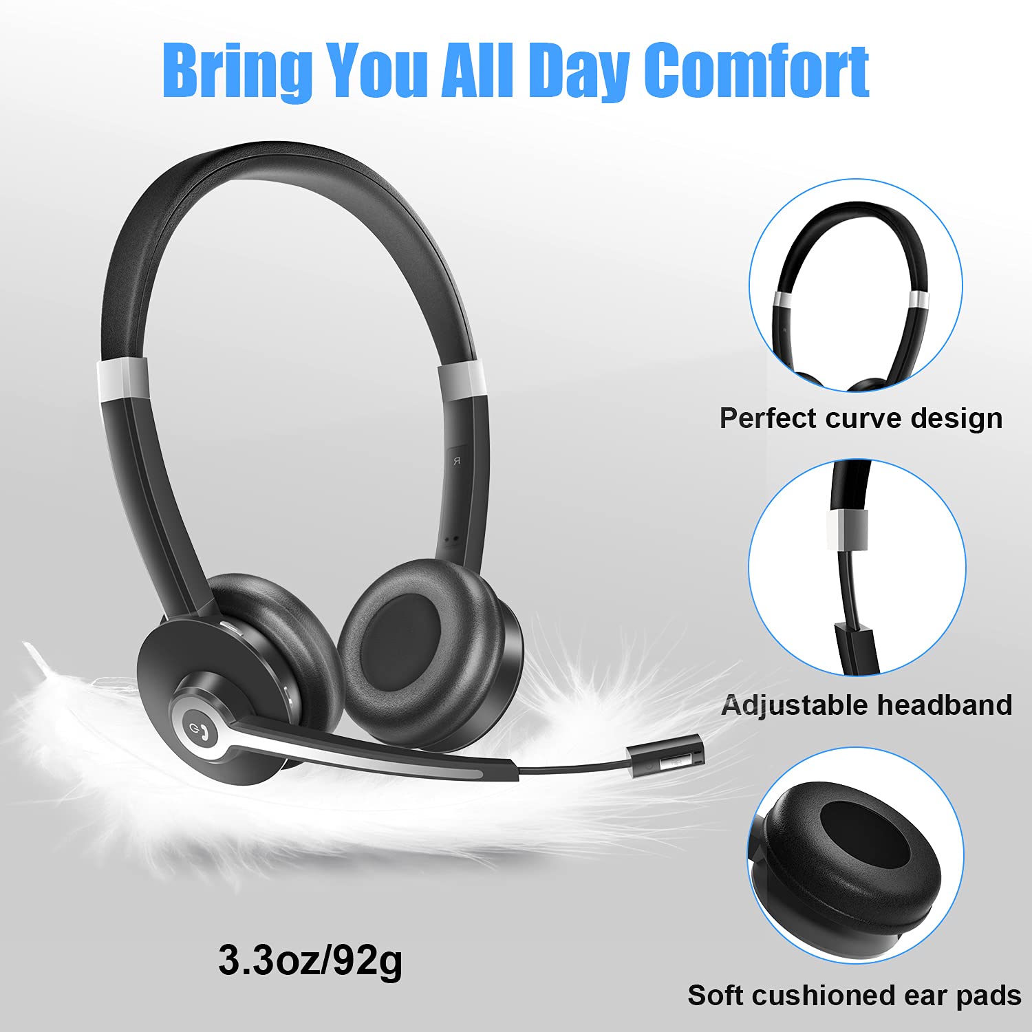 - Comfortable Wear: The headset's ergonomic design, weighing just 3.3 oz (92g), makes it ultra-light and comfortable. The memory foam cushioned ear pads ensure all-day comfort, while the adjustable headband fits all head sizes.