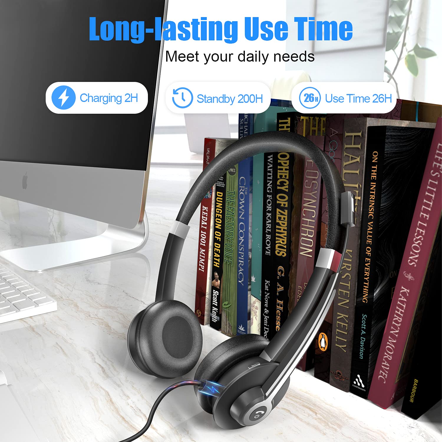 - Long-lasting Battery: With 26 hours of usage time and 200 hours of standby time, you won't have to worry about charging your headset every few hours. A 2-hour full charge keeps you ready for the whole day.