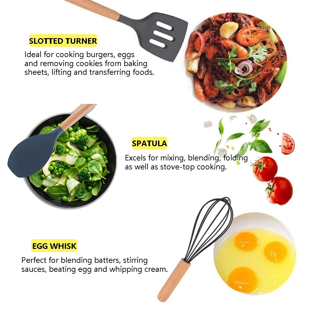 - Durable & Non-Stick: The silicone heads prevent scratching or damaging non-stick cookware, keeping your pots and pans in top condition and extending their lifespan. The wooden handles add an extra layer of durability and comfort.