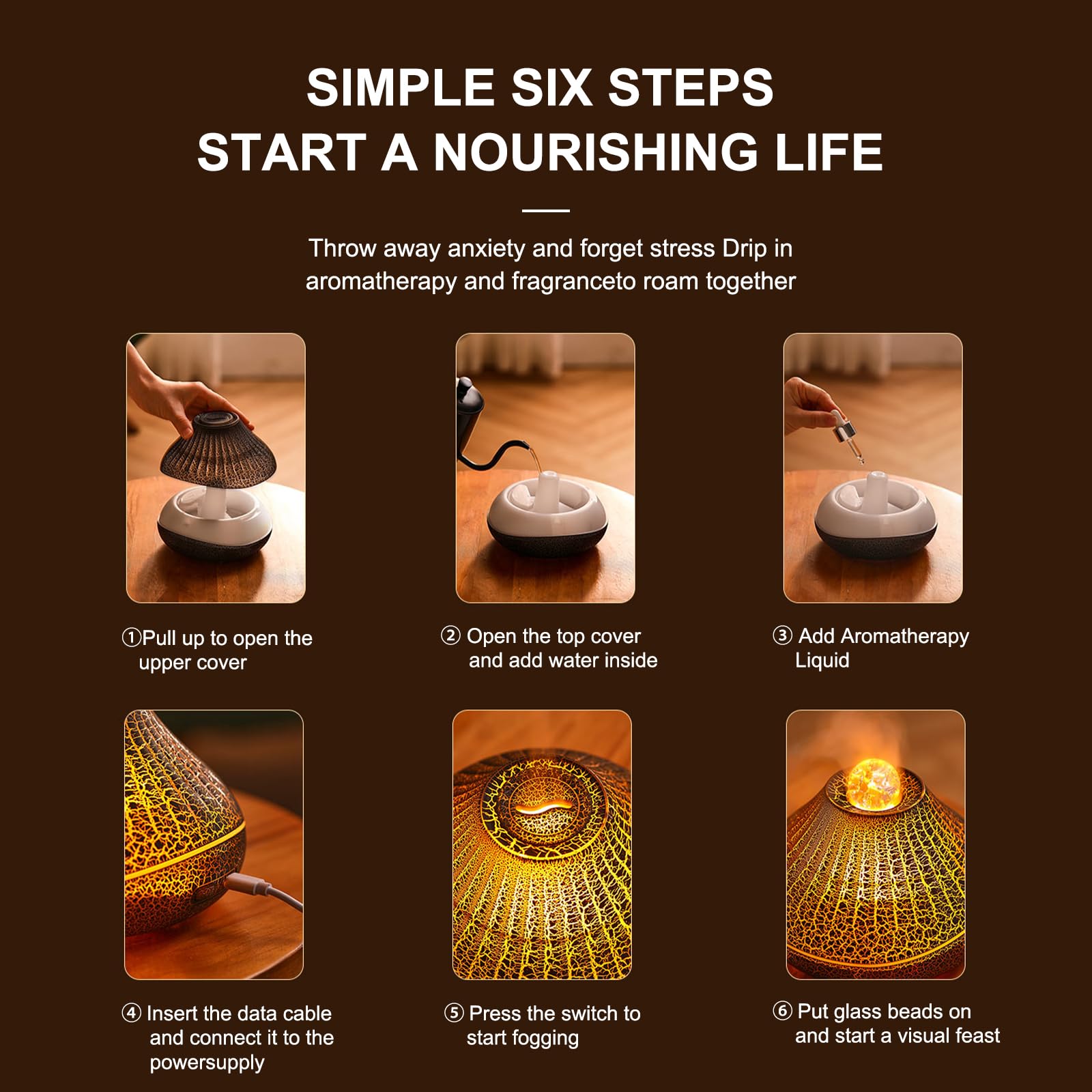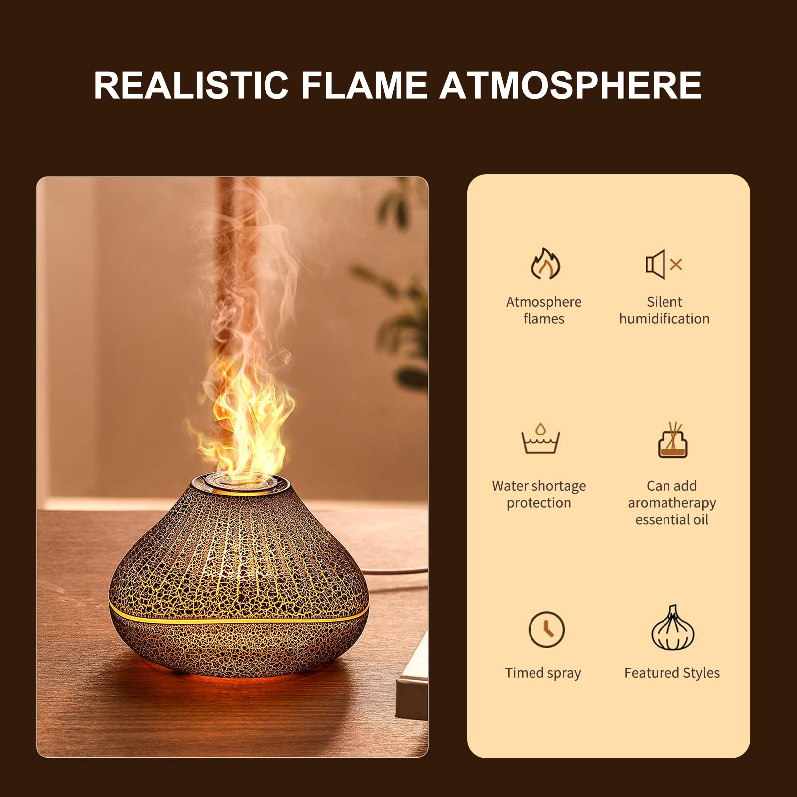 Flame Lights with Color Options: The ZYGSEVE Diffuser features a realistic flame light effect that mimics the cozy ambiance of a fire, adding a touch of elegance and tranquility to any room. Choose from a variety of lighting modes to match your mood.